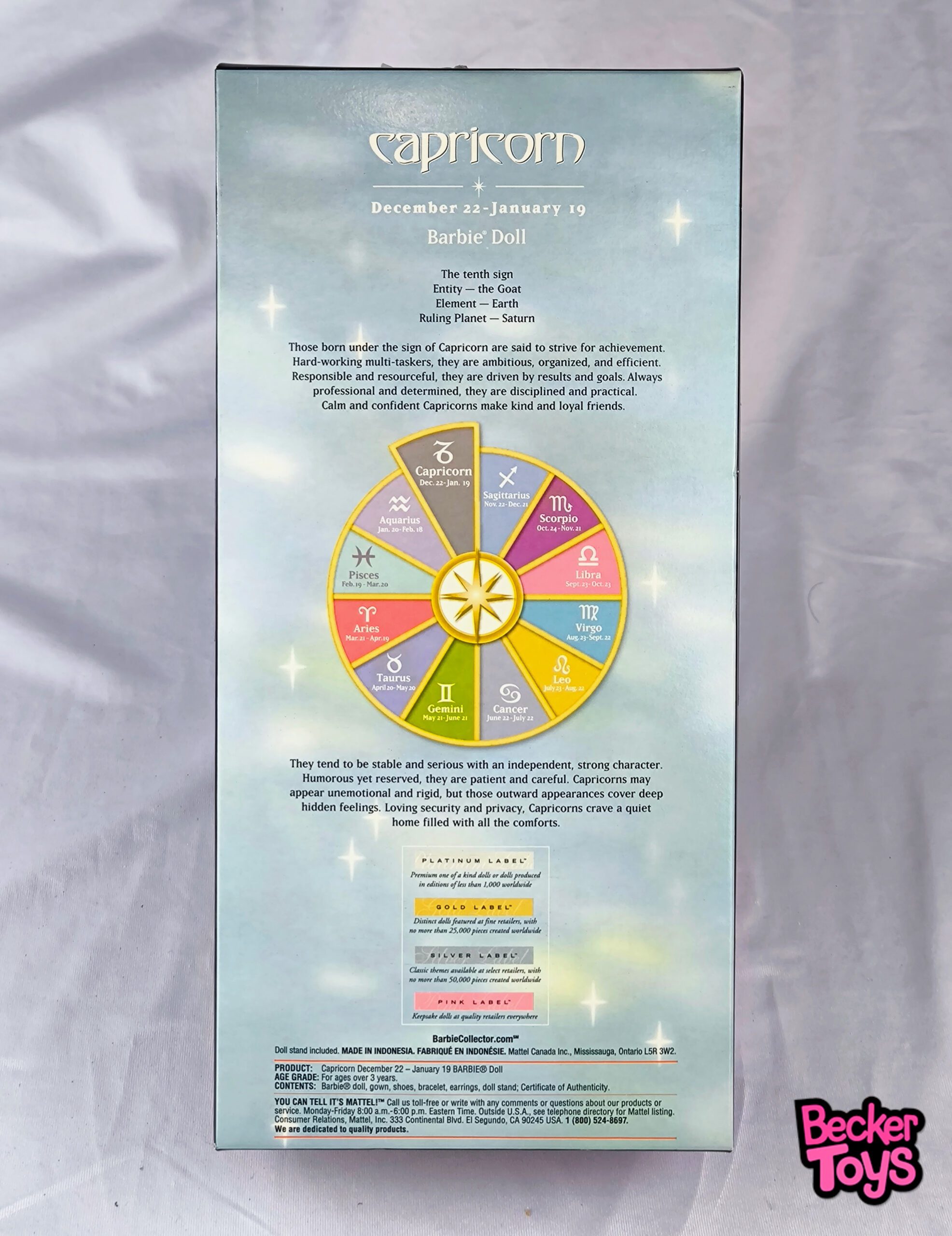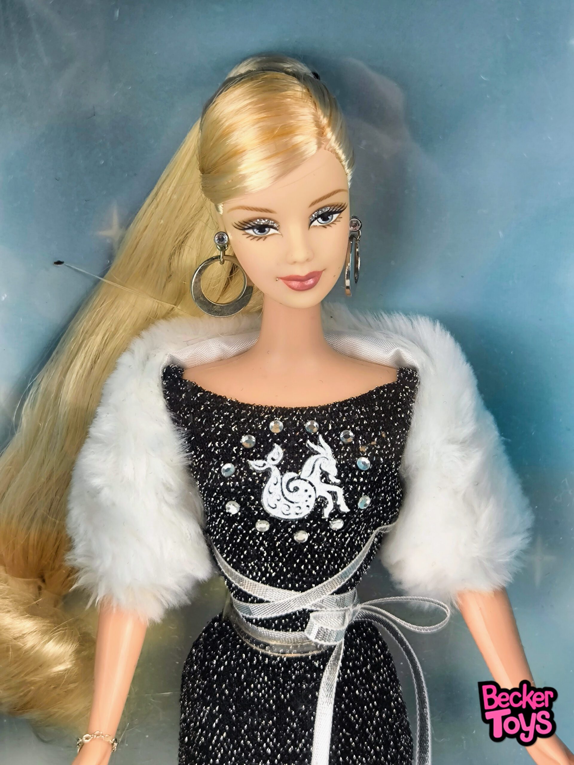 Barbie Capricornio 2004 forma parte de la colección Zodiac Collection de Mattel, bajo la etiqueta Pink Label. Esta muñeca representa el signo de Capricornio, con un diseño elegante y sofisticado que refleja la personalidad determinada y ambiciosa de quienes nacen bajo este signo.