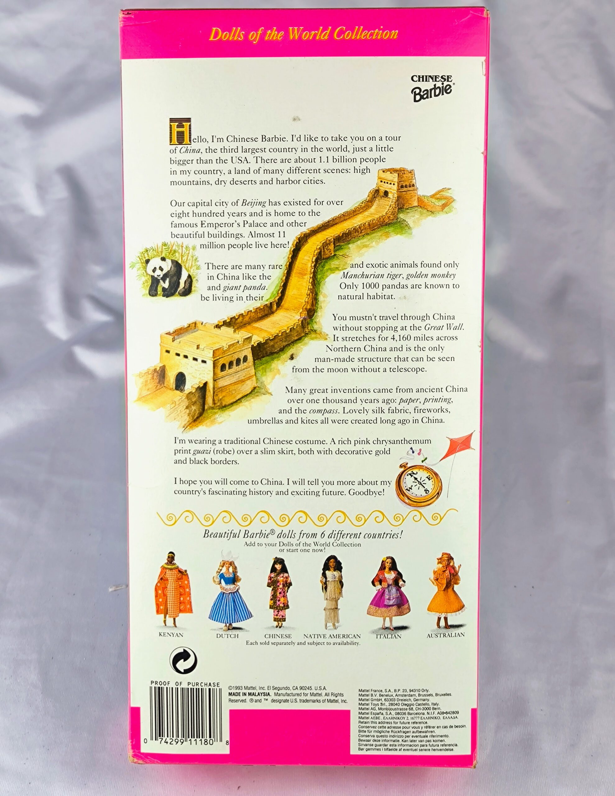 La Barbie Chinese de 1993 es una edición especial de la colección Dolls of the World. Esta muñeca Barbie está vestida con un traje tradicional chino, capturando la belleza y la tradición cultural de China. Viene con un guazi (túnica) de color rosa con estampado de crisantemos sobre una falda ajustada, ambos con el mismo diseño. La muñeca refleja la gracia simplista de la cultura china.