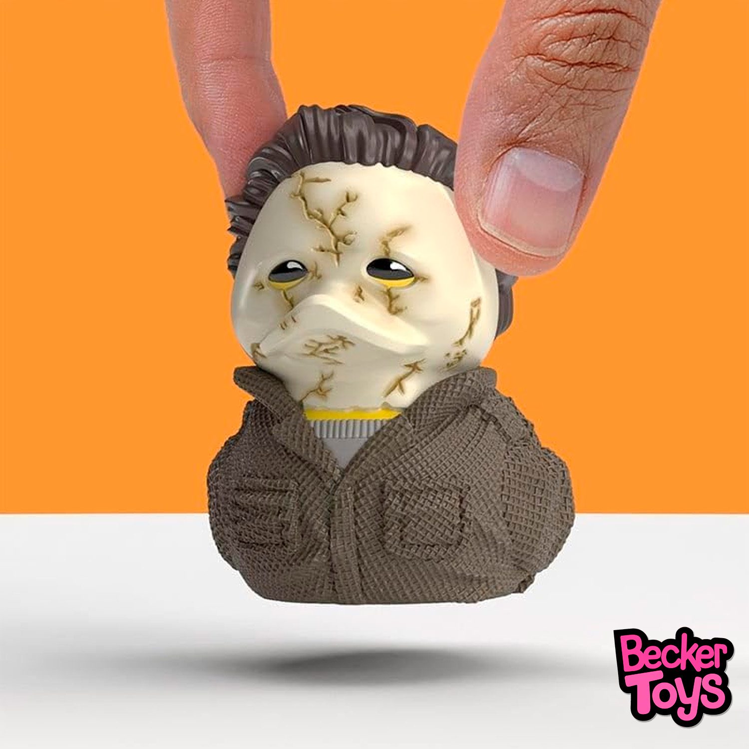 Michael Myers aparece con su clásica máscara blanca inexpresiva, traje de mecánico azul y cuchillo en mano, todo adaptado al cuerpo de pato. A pesar de su tamaño compacto, conserva los detalles más reconocibles del personaje, como su postura rígida y mirada penetrante. La figura viene presentada en una mini bañera decorativa con el logotipo de Halloween, ideal para vitrinas temáticas o escritorios.