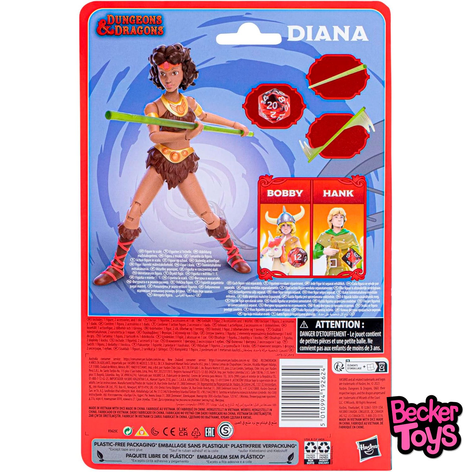 Hasbro lanzó una figura de acción de Diana de la serie animada de Dungeons & Dragons. Esta figura de aproximadamente 15 cm de altura está diseñada con un estilo premium y múltiples puntos de articulación, lo que permite tanto exhibirla como participar en aventuras imaginarias. Diana viene con todos los accesorios necesarios para luchar contra los monstruos más temibles del reino de Dungeons & Dragons.