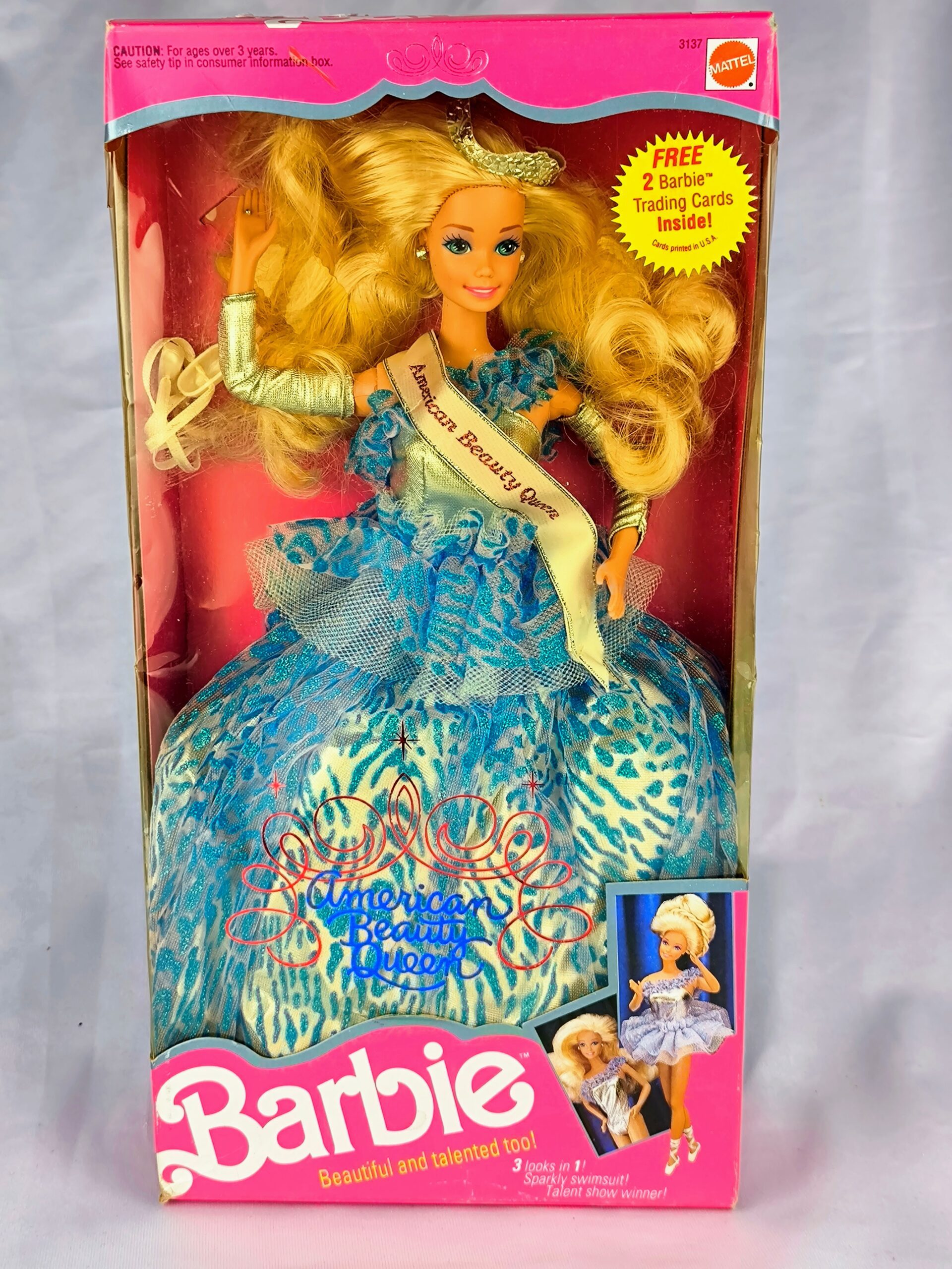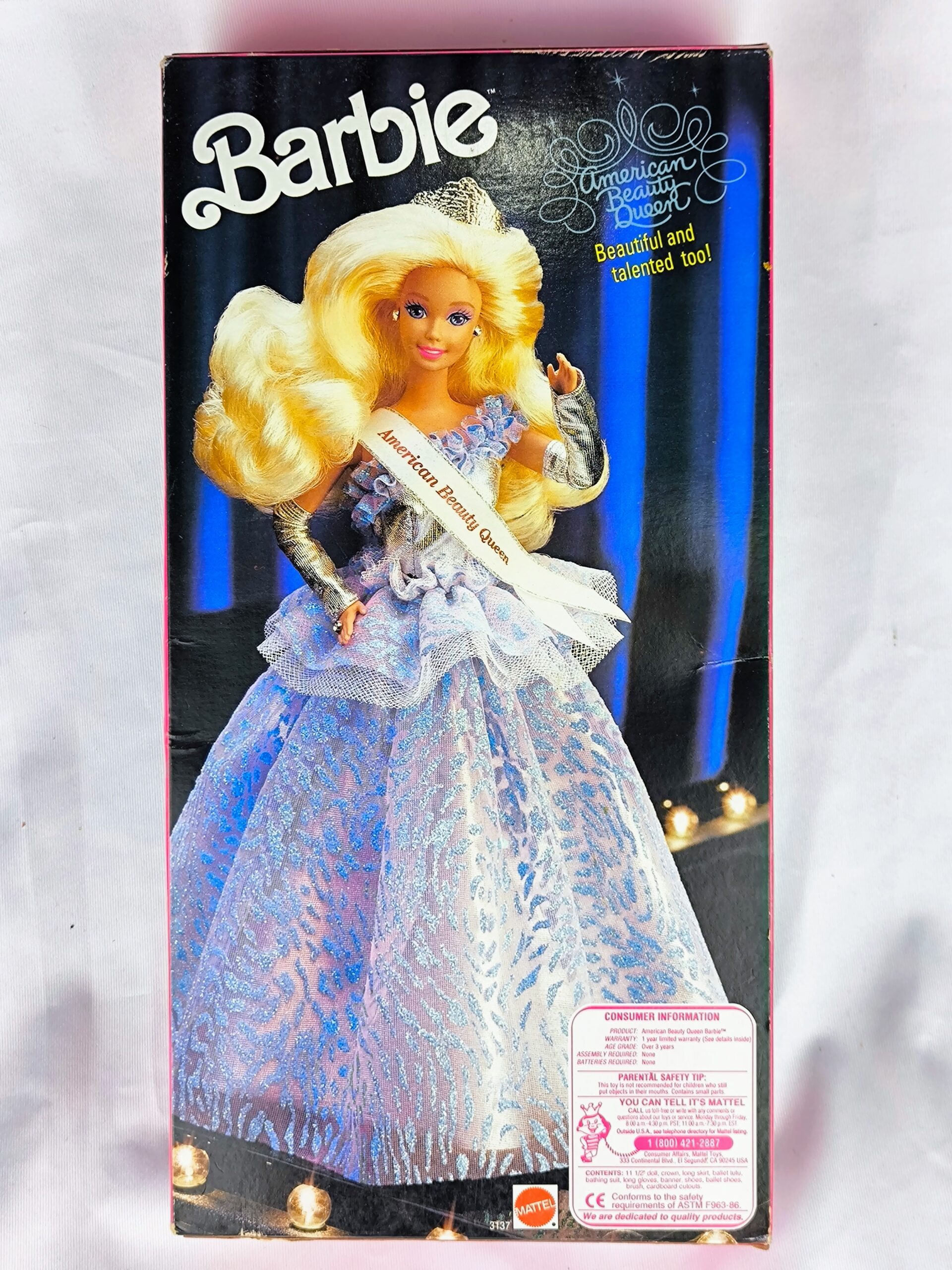 Barbie American Beauty Queen mide aproximadamente 29 cm de altura. Esta Barbie está vestida con un elegante vestido de gala en tonos azul y blanco, acompañado por una banda que dice «American Beauty Queen». La muñeca tiene «3 looks en 1: Sparkly swimsuit, Talent show winner!».