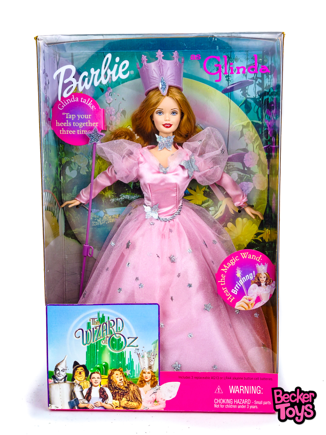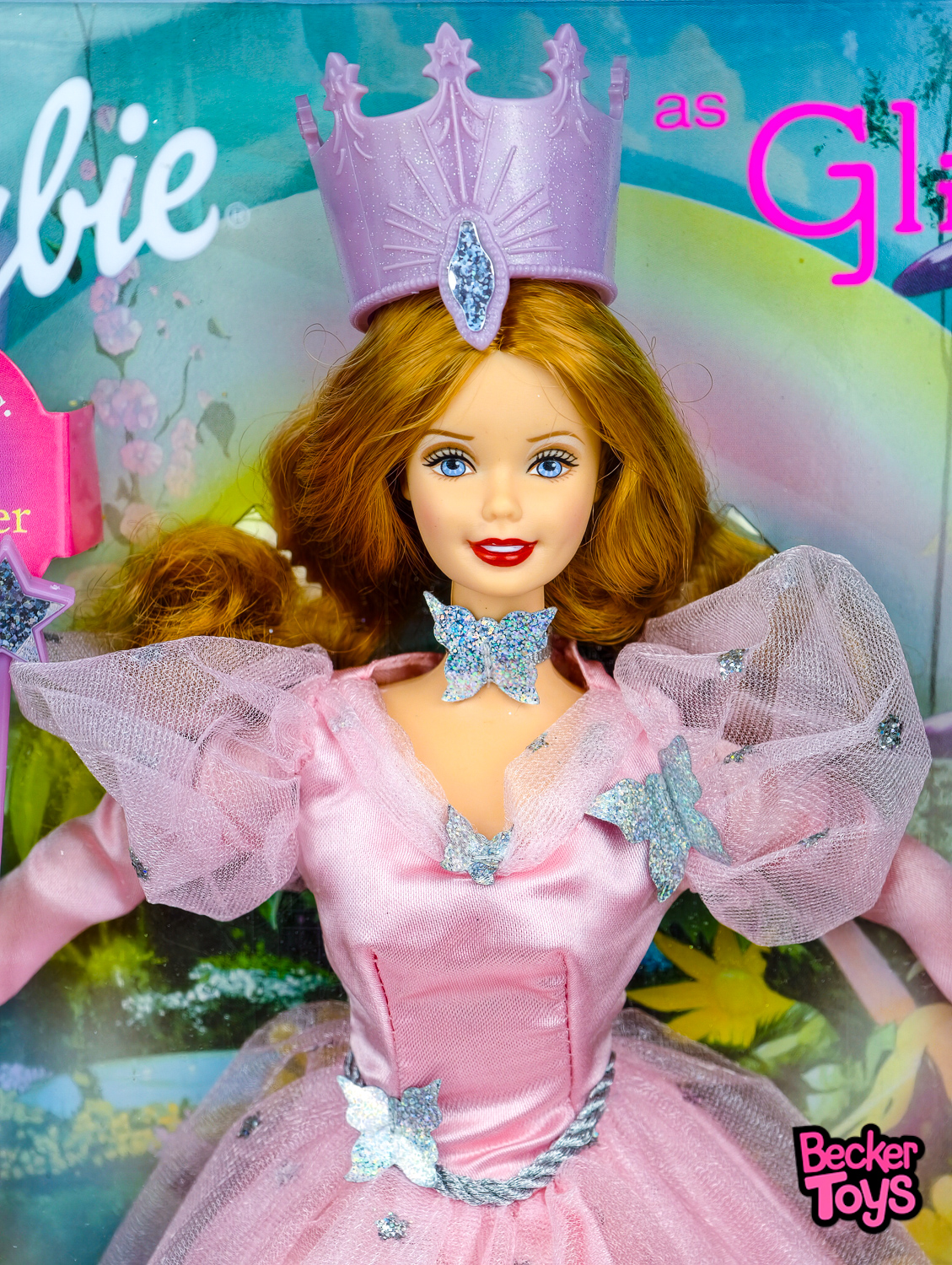 Esta Barbie representa a Glinda, la Bruja Buena del Norte, del clásico libro y película “El Mago de Oz”. La muñeca está vestida con un deslumbrante vestido de satén rosa adornado con estrellas plateadas y mariposas. Su cabello es largo, rizado y de un tono rubio fresa, coronado con una alta corona de color lavanda-rosado.