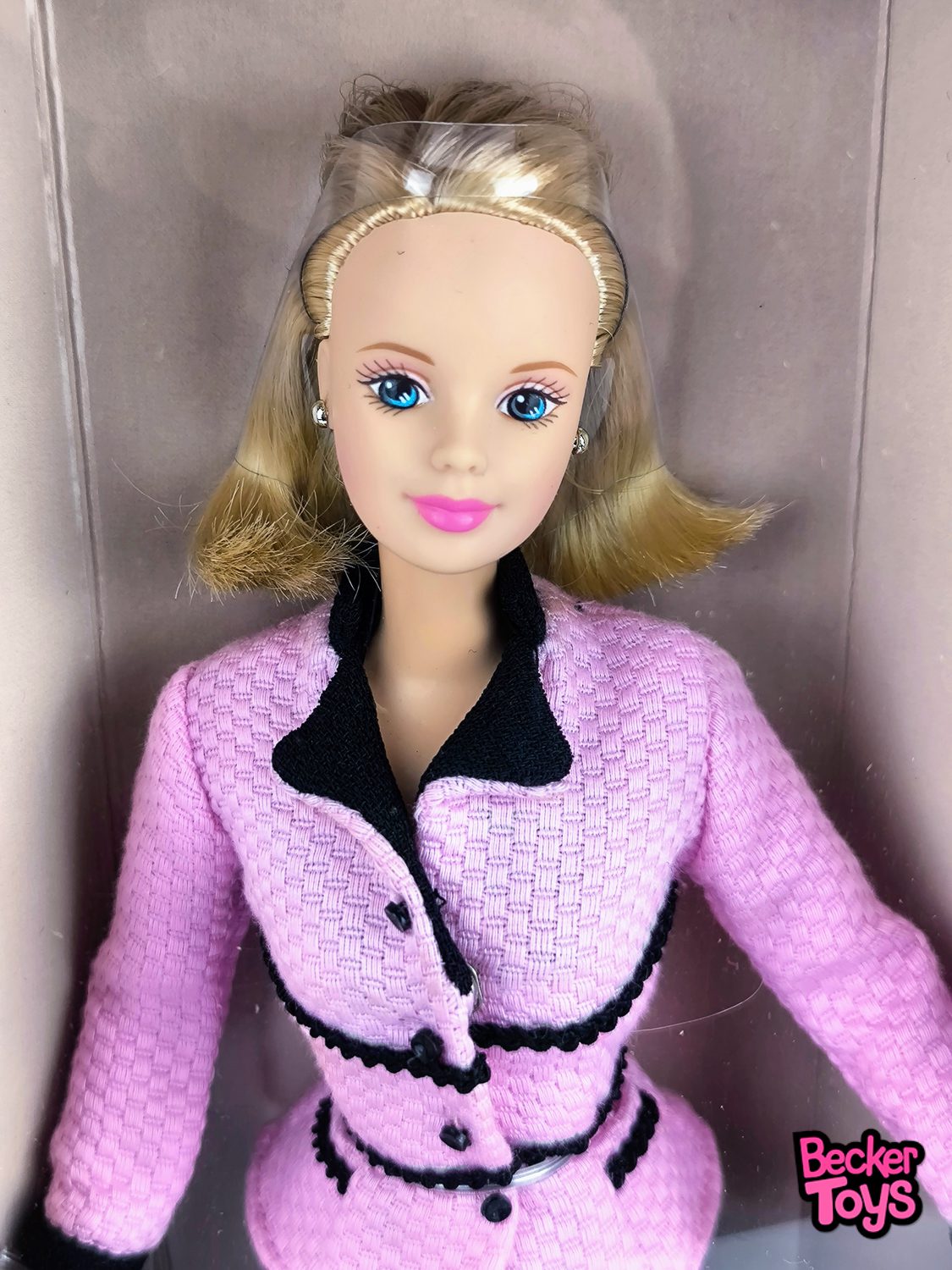 La muñeca viene con un elegante traje de negocios, un bolso, pendientes y un soporte para exhibición. Está disponible en versiones afroamericana, caucásica e hispana, celebrando la diversidad y el empoderamiento femenino. Esta edición es muy apreciada por los coleccionistas por su diseño detallado y su significado especial.