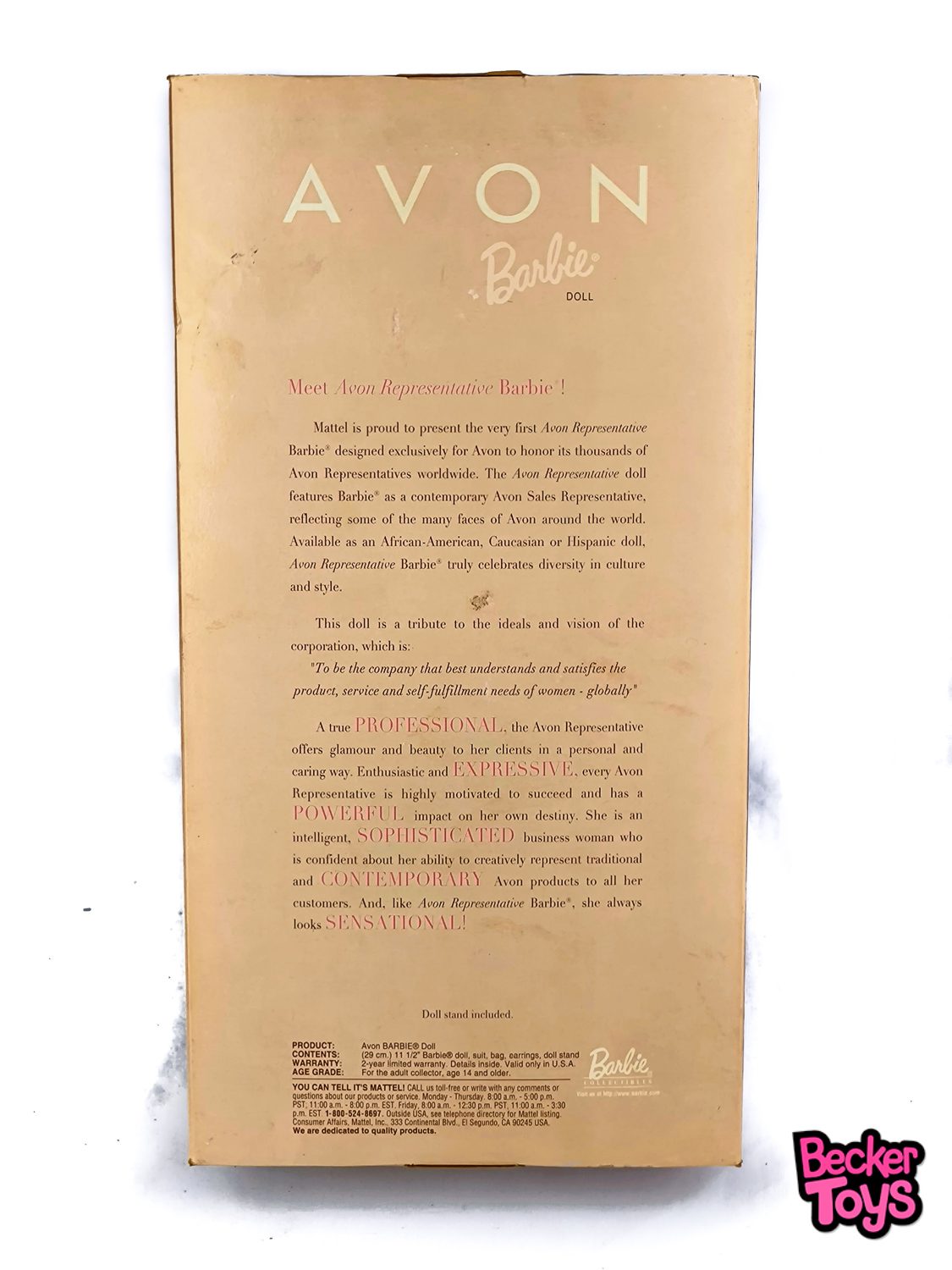 La Barbie Avon Representative de 1998 es una edición especial diseñada exclusivamente para AVON para honrar a sus miles de representantes en todo el mundo. Esta muñeca presenta a Barbie como una representante de ventas contemporánea de AVON, reflejando la diversidad cultural y de estilo de la marca.