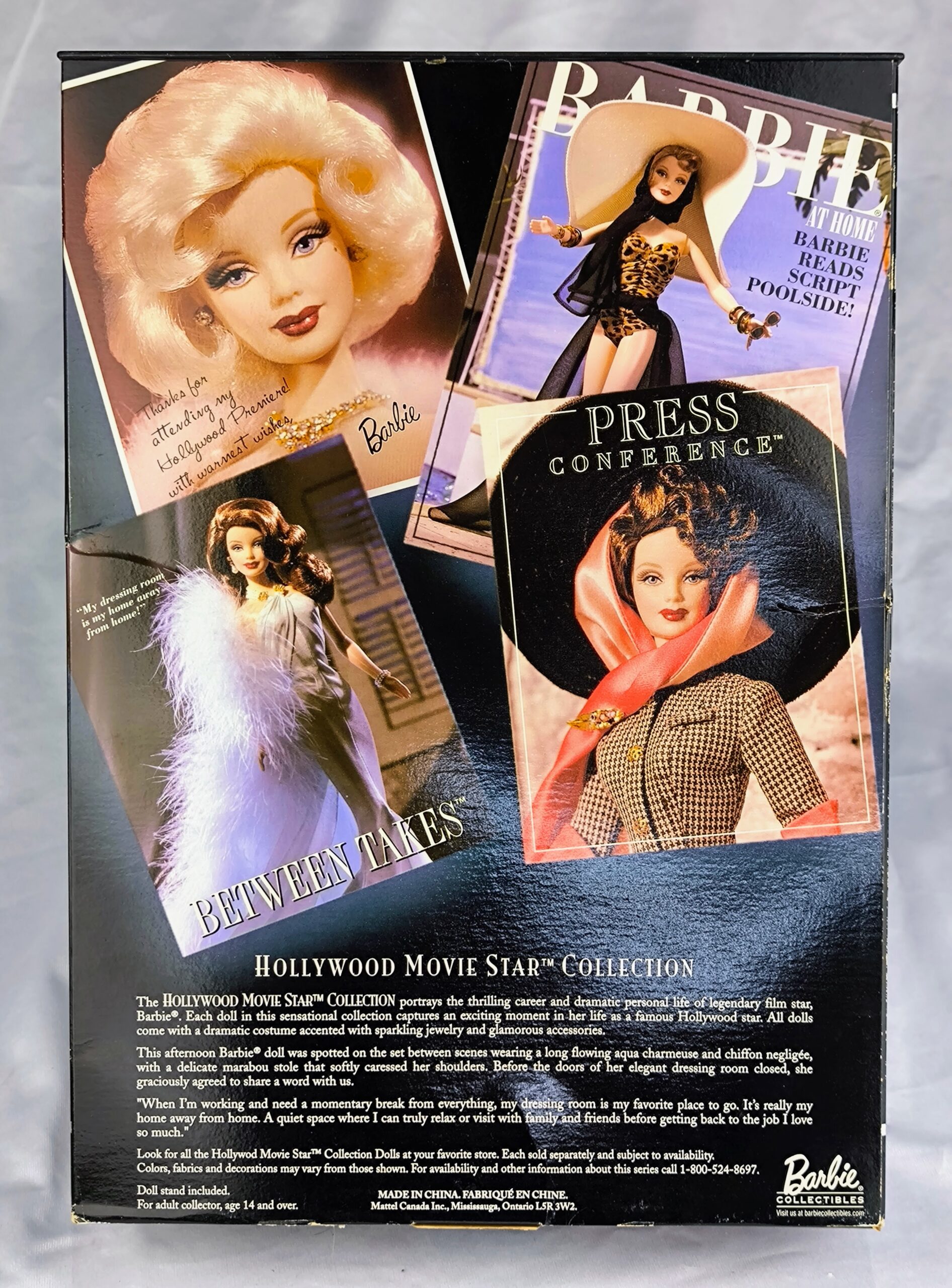 Barbie Between Takes – Hollywood Movie Star Collection del 2000 es una de las encantadoras figuras de Barbie de la colección «Hollywood Movie Star». En esta edición, Barbie está representada como una estrella de cine glamurosa descansando entre escenas. Lleva un elegante vestido de negligee en color azul claro de charmeuse y chiffon, con un manto de marabou que suavemente cae sobre sus hombros. El vestido tiene un largo cola flotante que añade un toque de elegancia.