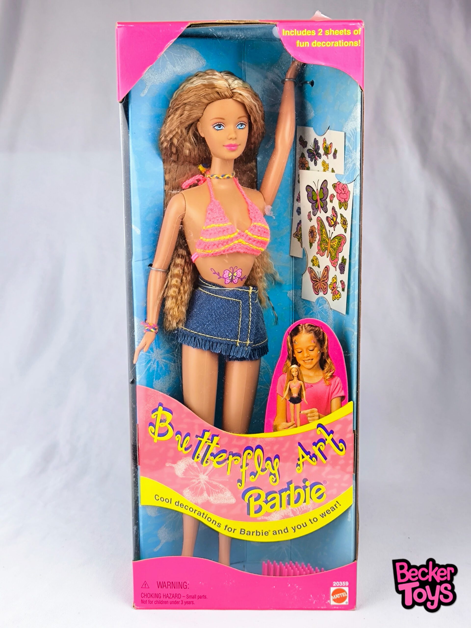 Además, la muñeca viene con 2 hojas de decoraciones geniales, que son tatuajes temporales para que los niños puedan decorar tanto a la muñeca como a sí mismos. La Barbie Butterfly Art se distingue por tener “tatuajes” en su cuerpo, lo que en su momento generó cierta controversia y llevó a Mattel a retirar las muñecas con tatuajes de los estantes.