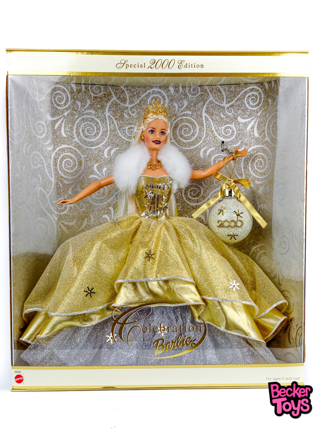 ¡Marca el inicio de un nuevo milenio con la deslumbrante Barbie Celebration del año 2000! Esta muñeca especial está vestida para la ocasión con un impresionante vestido dorado y blanco, decorado con detalles brillantes que evocan la celebración del Año Nuevo. Su elegante look se completa con un peinado sofisticado y accesorios a juego, incluyendo una tiara y joyería dorada. Perfecta para coleccionistas y entusiastas de las festividades, la Barbie Celebration 2000 es una pieza emblemática que captura el espíritu festivo y la esperanza de un nuevo comienzo.