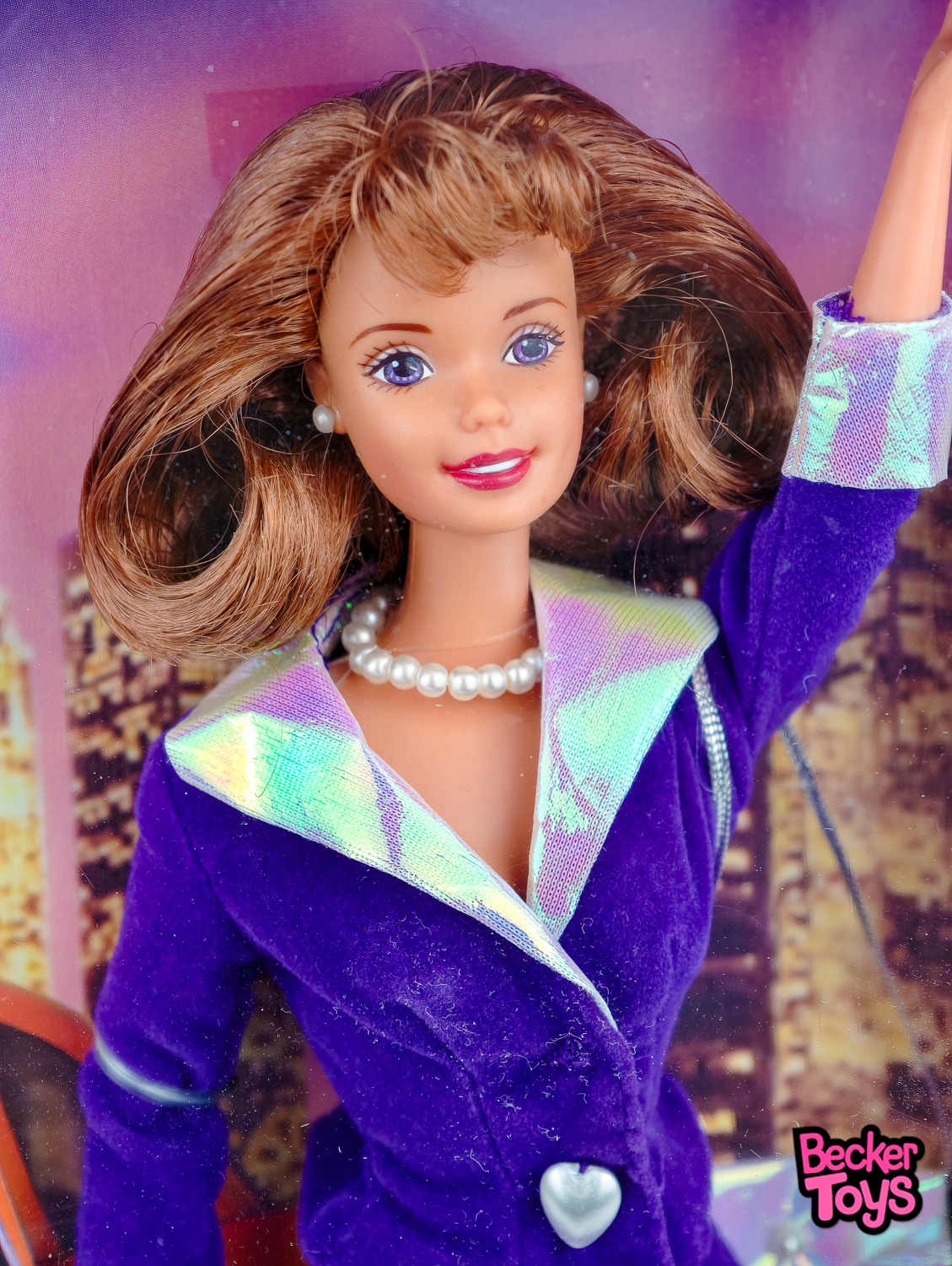Para complementar su atuendo, Barbie lleva joyería de perlas, incluyendo un collar y pendientes, que le añaden un aire de sofisticación. Además, sus zapatos de tacón alto y su bolso de mano de color púrpura acentúan su estilo metropolitano, haciendo que sea perfecta para cualquier ocasión en la gran ciudad.