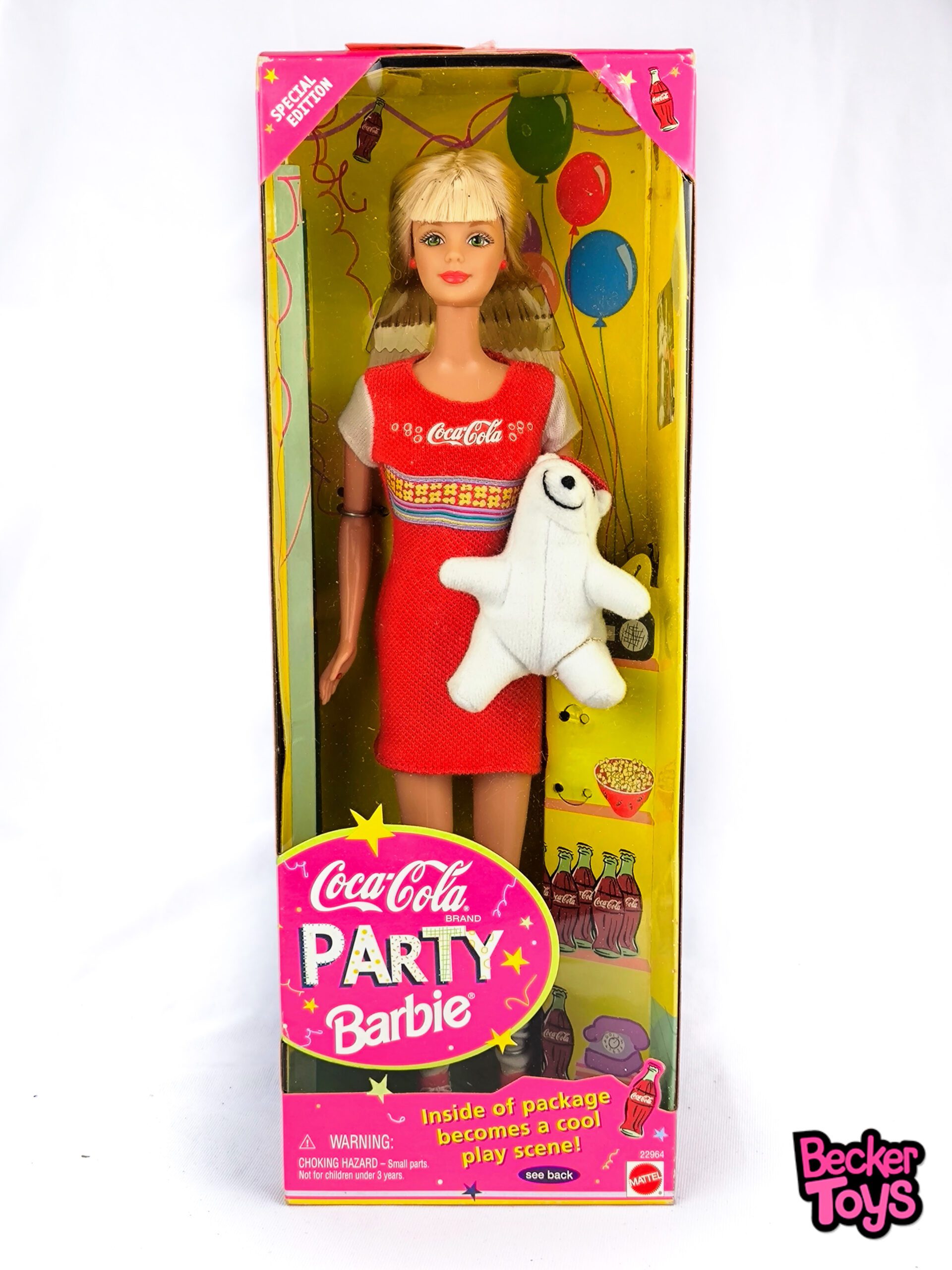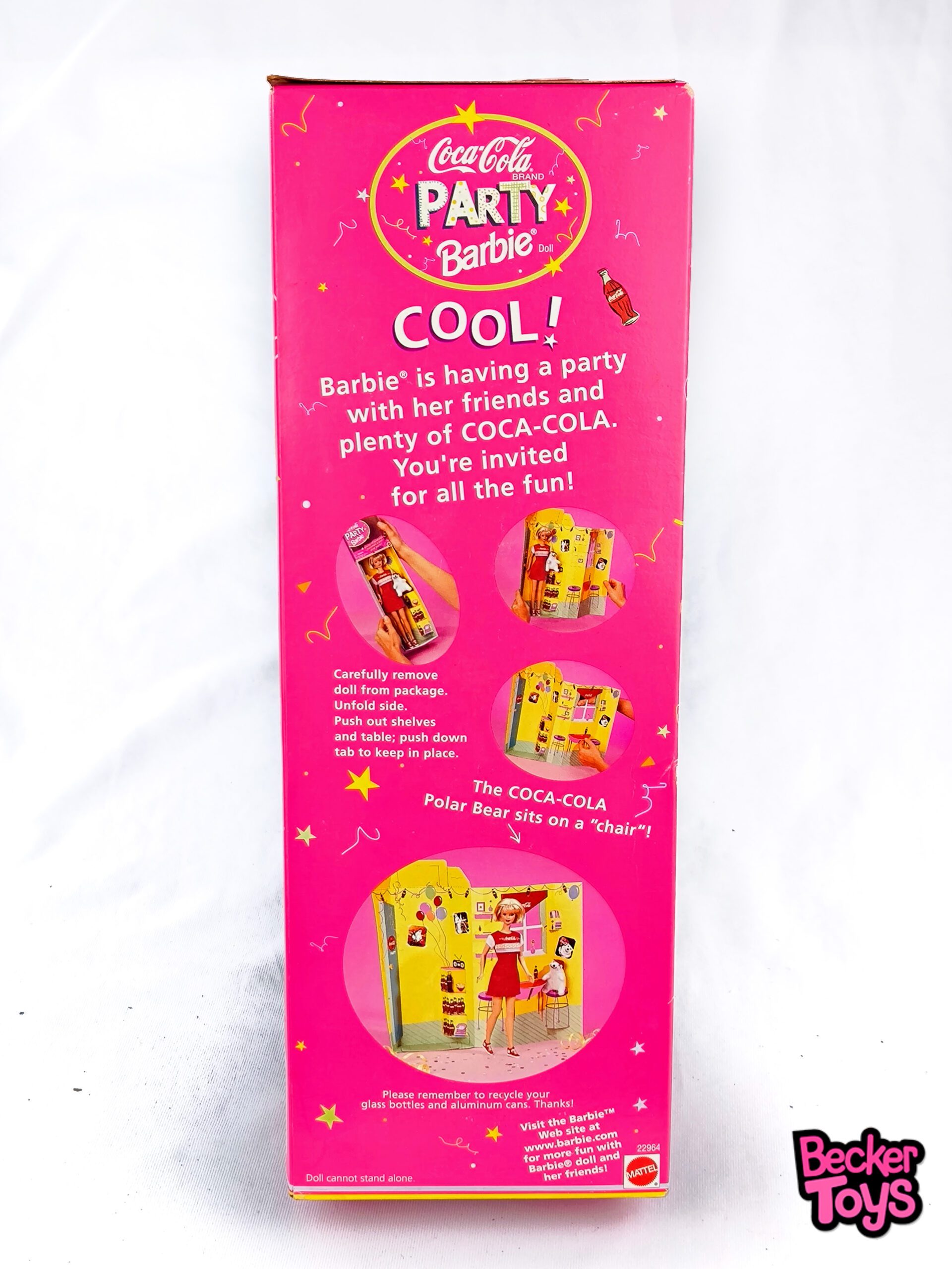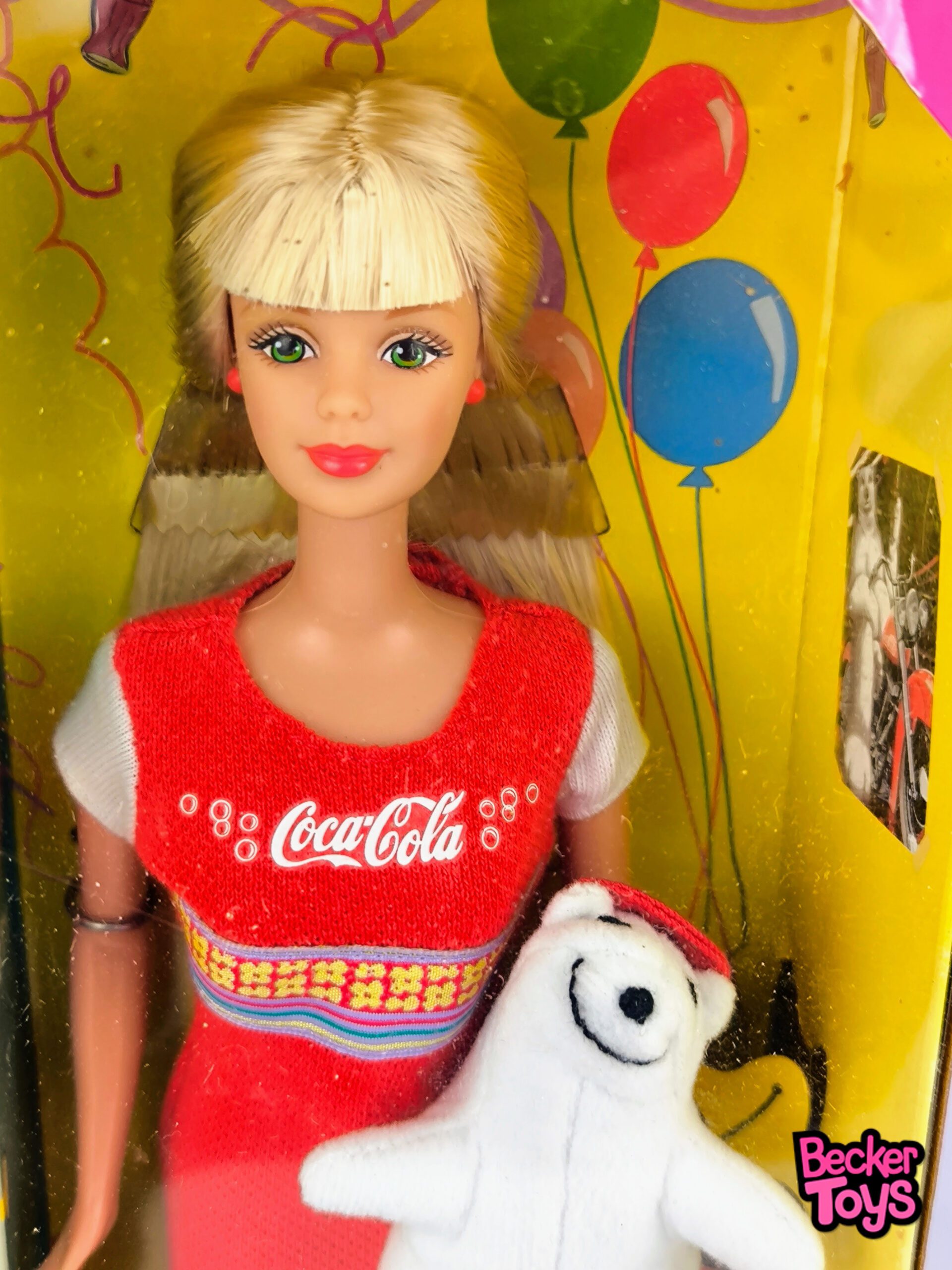 Barbie Coca Cola Party de 1998 es una Barbie especial de la colección Coca Cola Party. Esta Barbie está vestida con un vestido rojo brillante con detalles en blanco y amarillo. Viene acompañada de un oso polar miniatura dentro de la caja, que se convierte en una escena de juego divertida. Esta Barbie es muy valorada entre los coleccionistas debido a su temática única y su diseño atractivo.