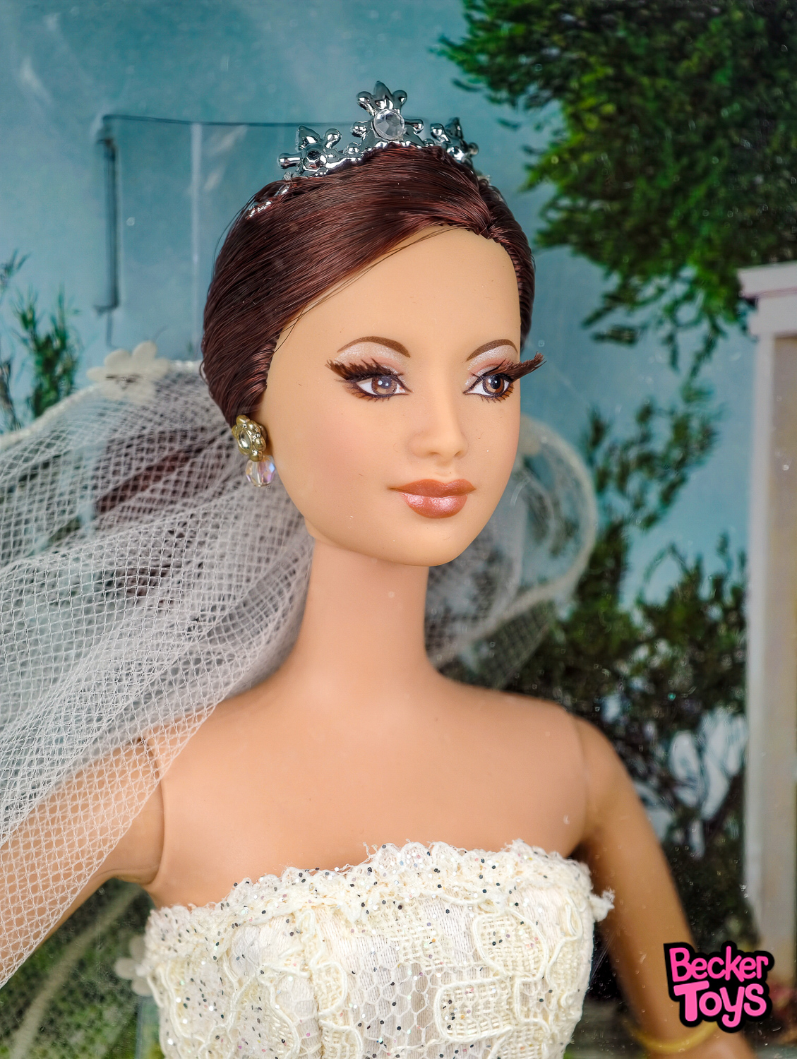 La muñeca presenta cabello castaño recogido, pendientes visibles y un estilismo de novia clásico.