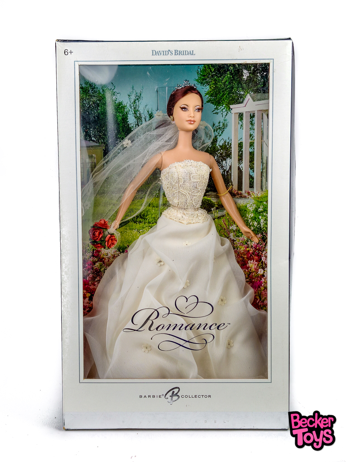 Barbie David’s Bridal Romance Brunette de 2006 en su caja original. Muñeca de colección de Barbie Collector inspirada en un diseño de David’s Bridal, presentada como una edición de temática nupcial. Luce vestido de novia largo en tono marfil, con cuerpo palabra de honor decorado con encaje, falda amplia con aplicaciones florales, velo de tul, tiara y ramo de flores en tonos rojos.