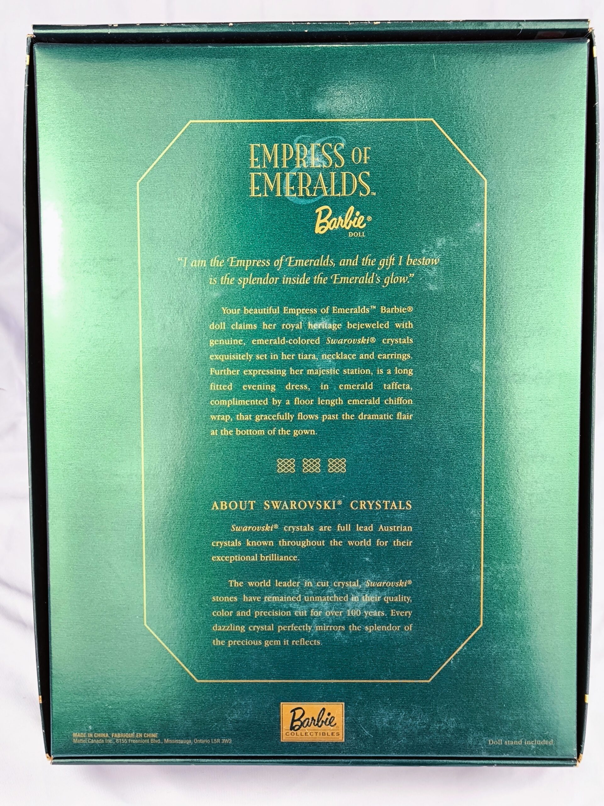 Barbie «Empress of Emeralds» de 1999 es una pieza de colección que forma parte de la serie Royal Jewels Collection. Esta muñeca rinde homenaje a la elegancia y belleza de las gemas preciosas, en particular a la esmeralda. Su vestido está confeccionado en tafetán y gasa de un deslumbrante color verde esmeralda, que sirve como fondo perfecto para sus exquisitas joyas. Estas joyas incluyen cristales Swarovski de color esmeralda, cuidadosamente diseñados para resaltar su esplendor. Desde su brillante tiara hasta su colgante, esta Barbie es un tributo a la sofisticación y el lujo