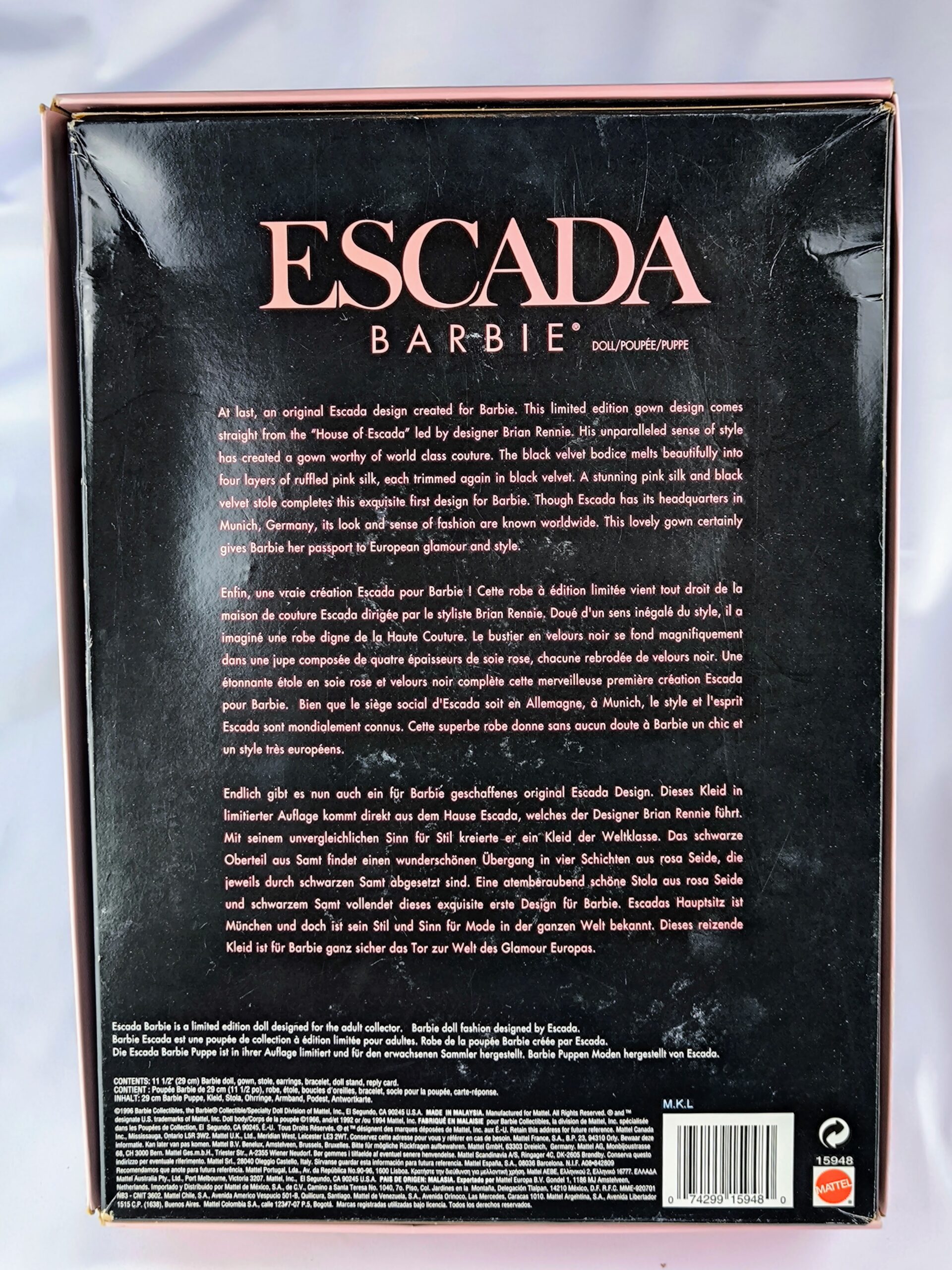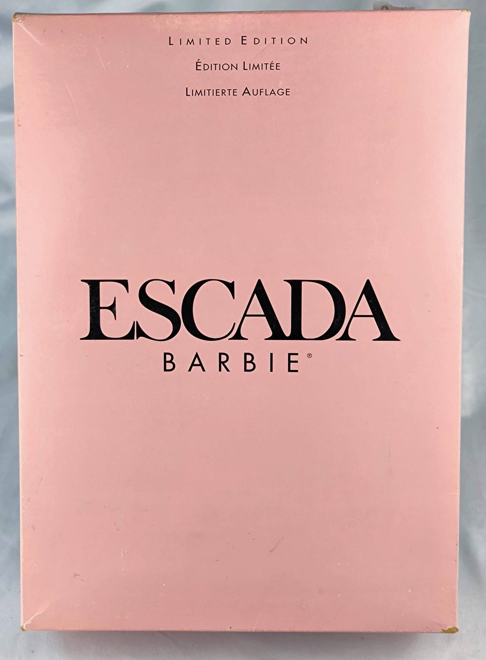 Muñeca de edición limitada Barbie Escada de 1996. Nueva, nunca sacada de la caja. Caja dañada. Restos de terciopelo en la cara, fácilmente retirables.