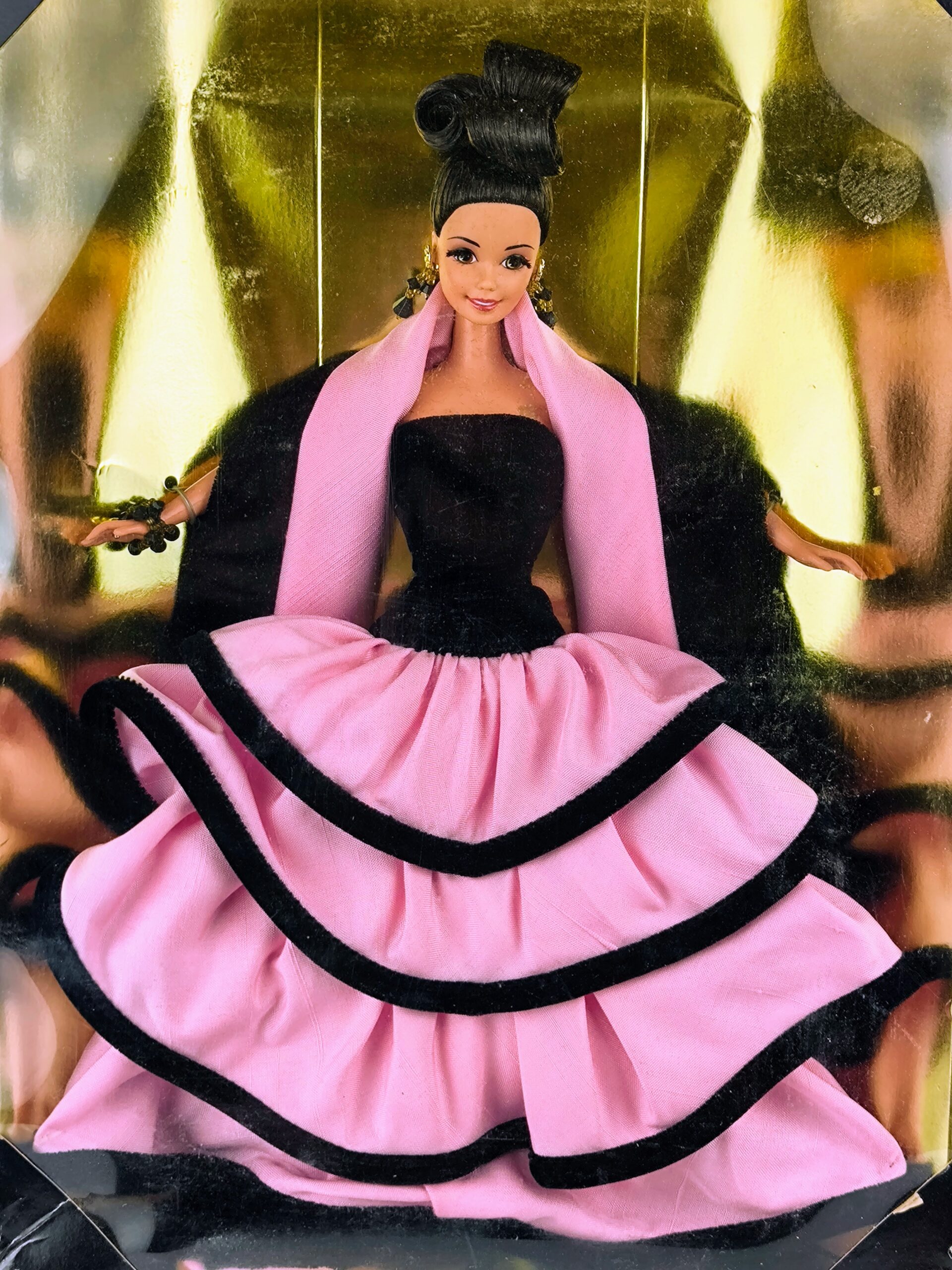 Barbie Escada de 1996 es una colaboración especial entre Mattel y la casa de moda de lujo alemana Escada. Esta muñeca lleva un vestido espectacular de satén rosa brillante con volantes en capas y detalles en negro, que le dan un toque dramático y elegante. La parte superior del vestido es negra, creando un contraste sofisticado con la falda voluminosa.