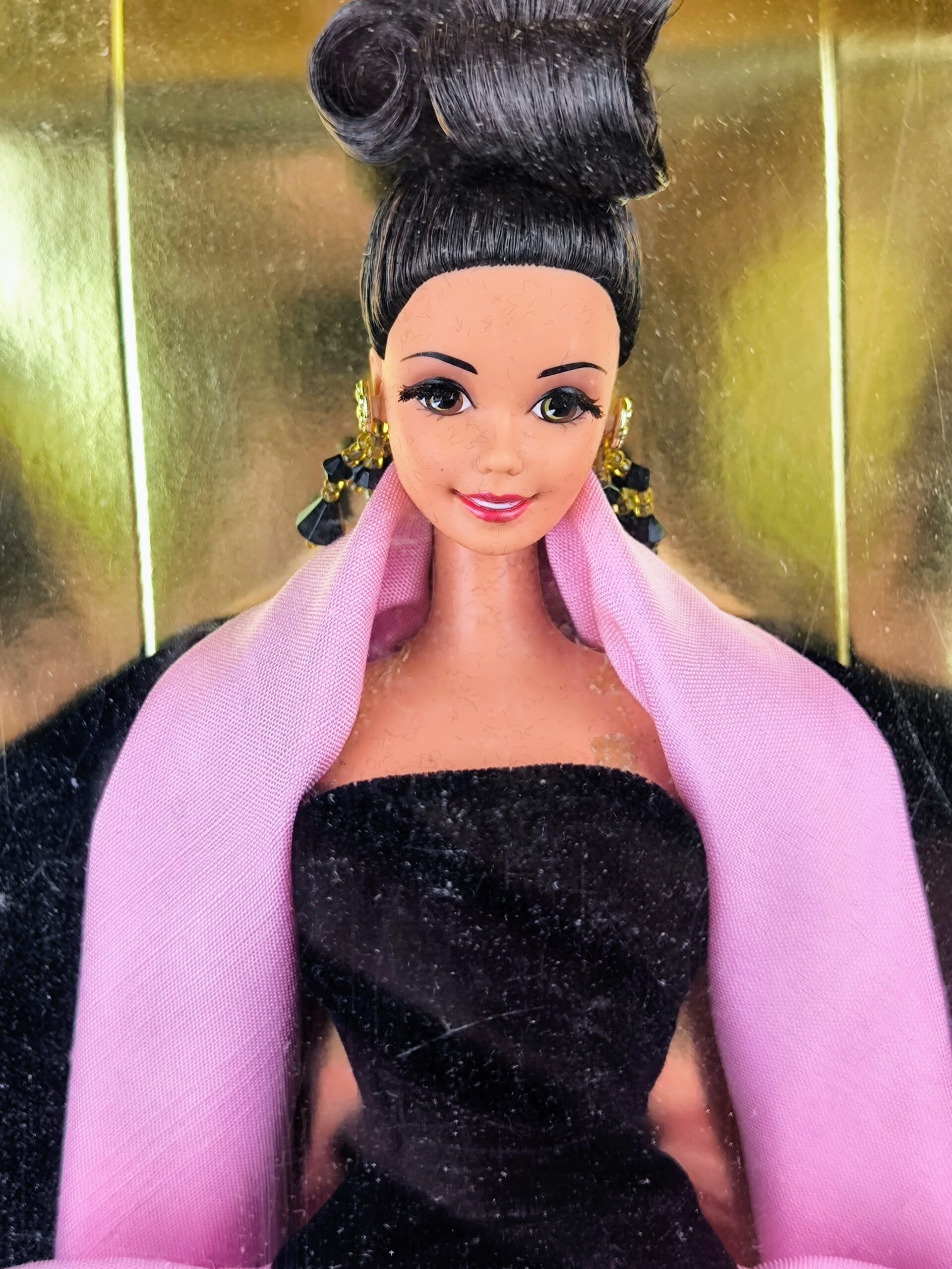 Además, la muñeca luce pendientes y brazaletes dorados, característicos del estilo lujoso de Escada. Su cabello está recogido en un moño refinado, complementando perfectamente su conjunto glamoroso.