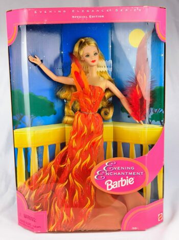 «Barbie Evening Enchantment» de 1997 es una edición especial que destaca por su elegancia y sofisticación. Esta muñeca forma parte de la serie «Evening Elegance» y viene vestida con un deslumbrante vestido rojo con detalles dorados simulando llamas y una capa de tul. Su cabello rubio está peinado en un elegante recogido, complementado con una pluma roja. Incluye accesorios como un collar y pendientes, perfectos para completar su look de gala. Esta Barbie es una pieza de colección ideal para los amantes de la moda y la nostalgia de los años 90, ofreciendo un toque de glamour y fantasía