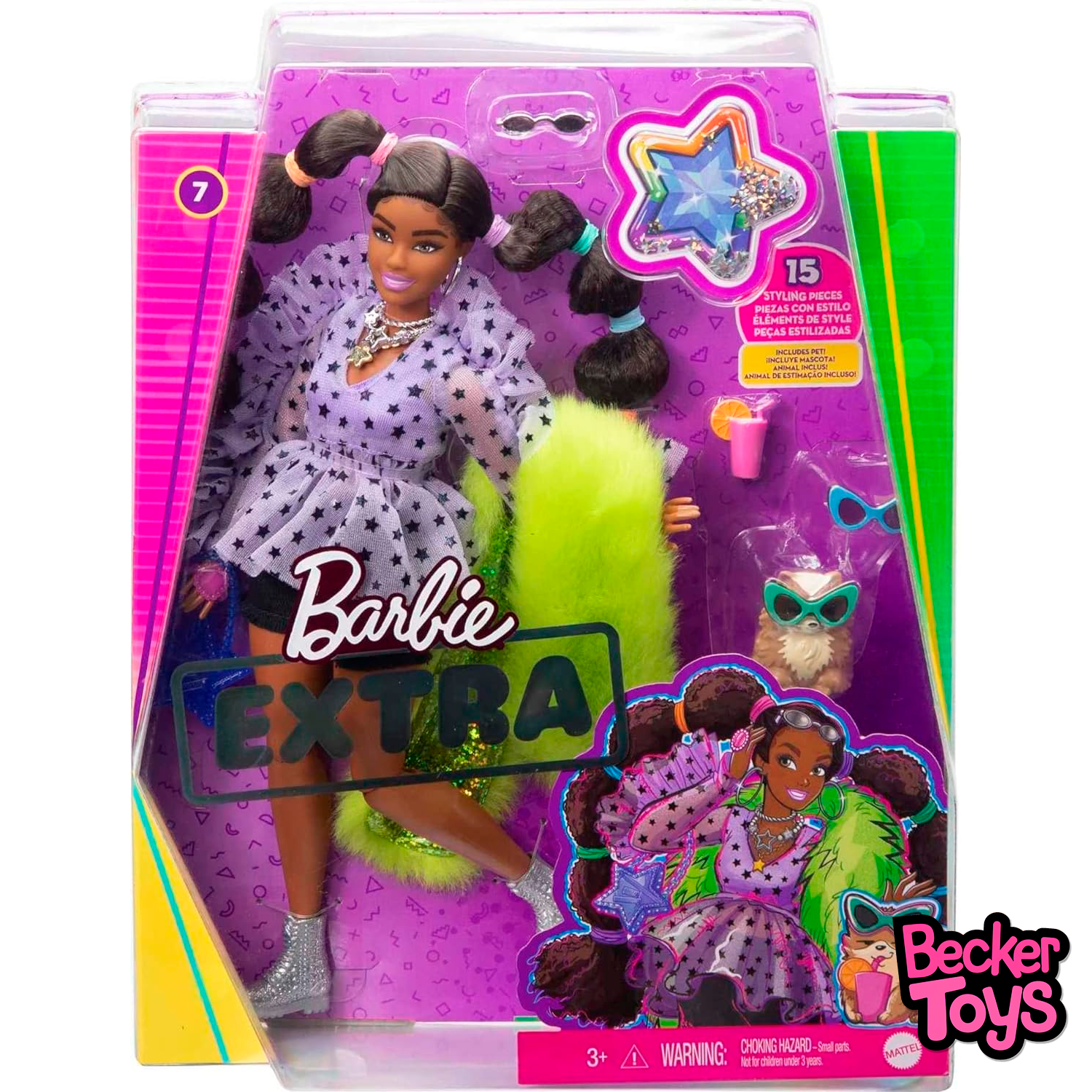 Los accesorios de styling son tan importantes como la ropa en esta línea. La muñeca viene con una variedad de complementos como gafas de sol sobredimensionadas, joyería extravagante, y bolsos con carácter. Además, cada Barbie Extra trae consigo una mascota adorable con accesorios a juego, añadiendo aún más carácter al conjunto.