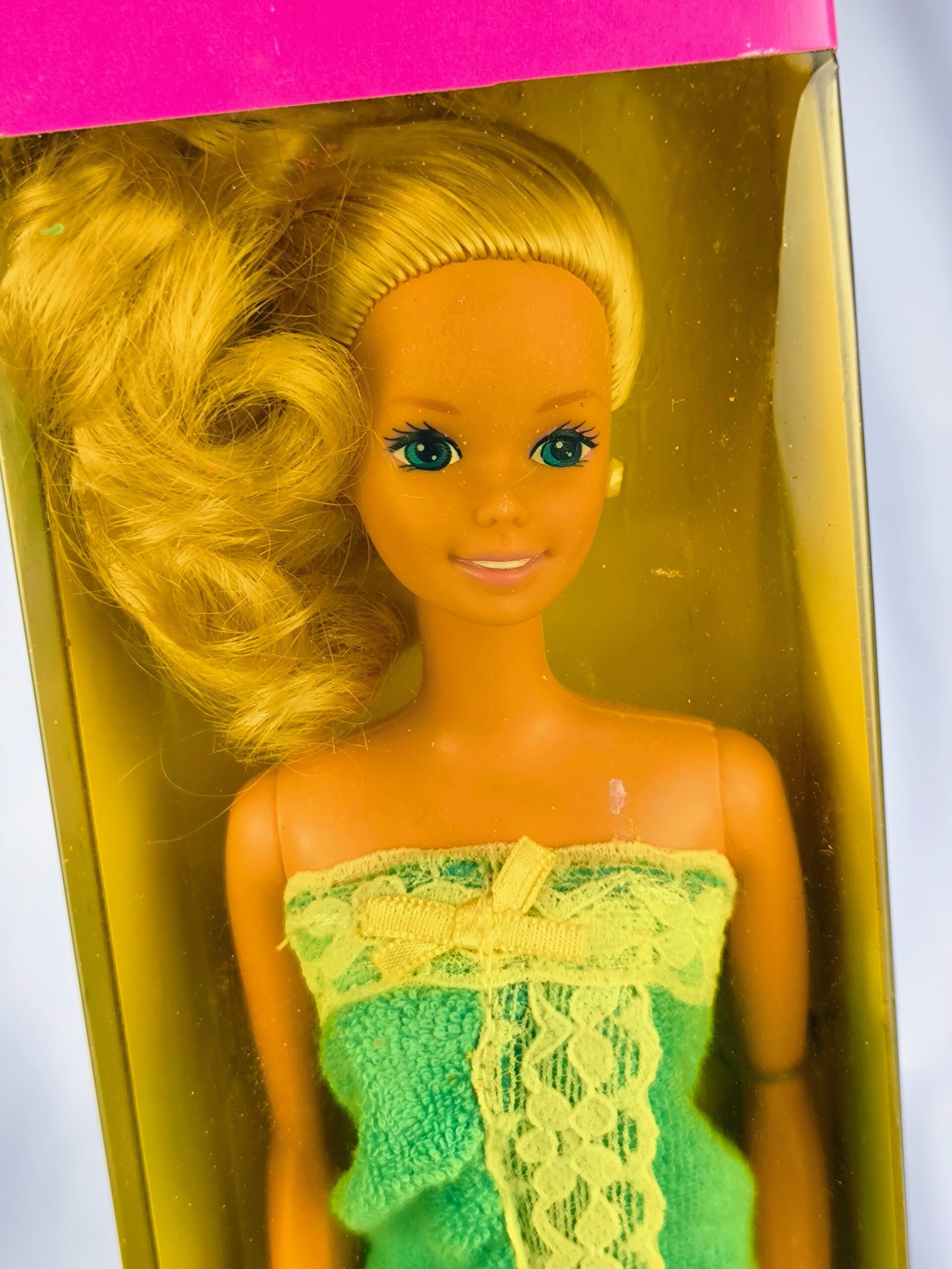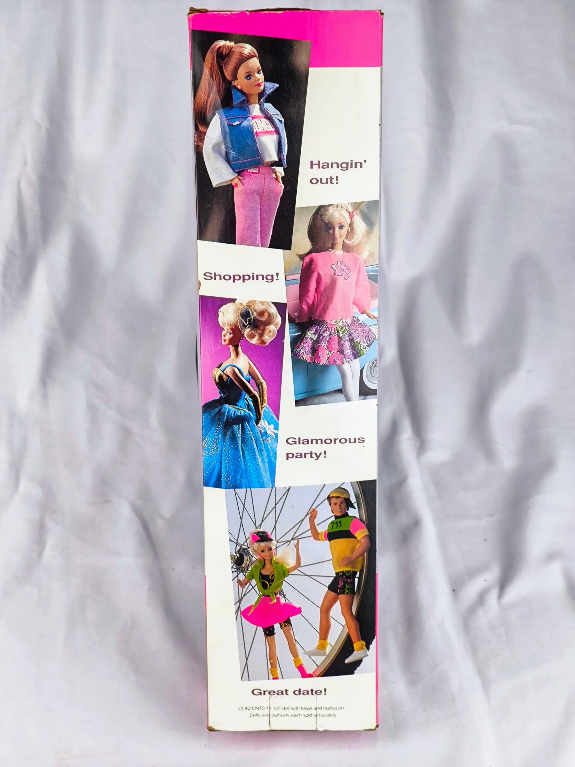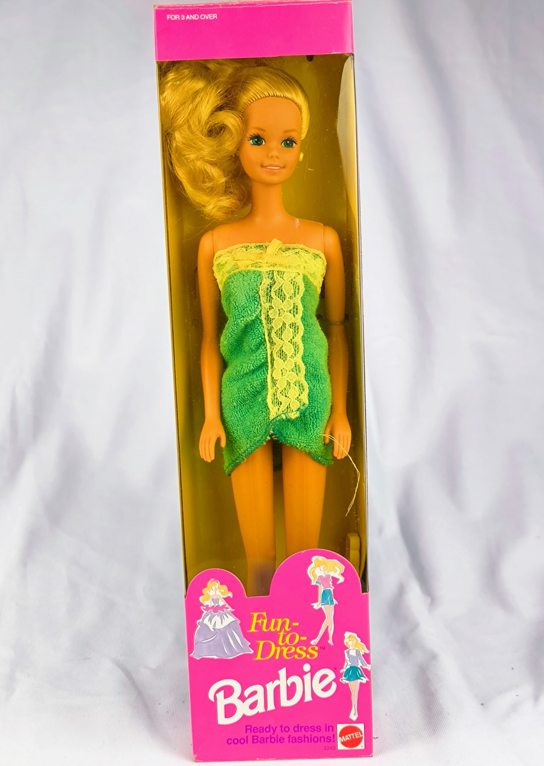 «Barbie Fun-to-Dress» de 1992 es una muñeca diseñada para inspirar la creatividad y el sentido de la moda en los niños. Viene vestida con un sencillo vestido verde, con detalles en encaje amarillo, que se asemeja a una toalla, lista para ser transformada con diferentes estilos. El empaque, predominantemente rosa, presenta el texto «Fun-to-Dress Barbie» y «¡Lista para vestir con las frescas modas de Barbie!» junto con el logotipo de Mattel. La Barbie tiene el cabello rubio peinado con mucho volumen, ideal para peinar y estilizar. El empaque también incluye ilustraciones de Barbie con diferentes atuendos, invitando a los niños a imaginar y crear sus propios looks.