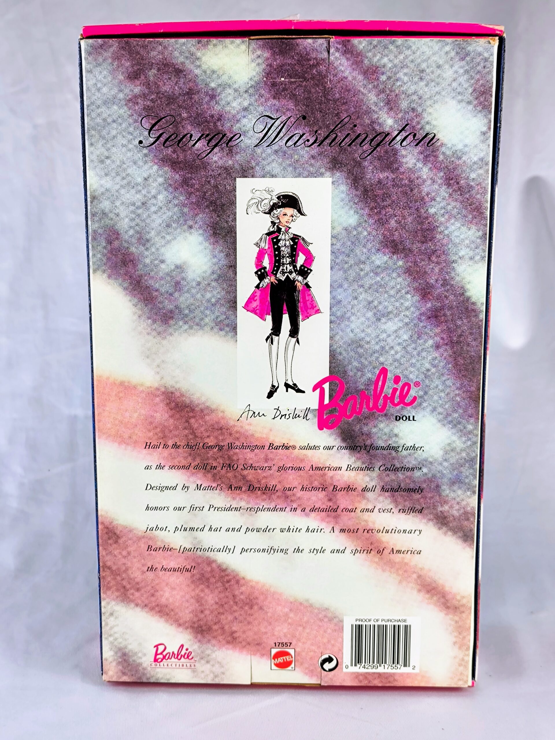 Diseñada por Ann Driskill de Mattel, esta Barbie histórica honra con elegancia al primer presidente de los Estados Unidos, luciendo un atuendo completo y un cabello blanco empolvado