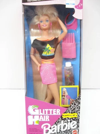 La Barbie Glitter Hair fue lanzada por Mattel en 1993 como parte de una línea que incluía también a Teresa (#10966) y Kayla (#11332), cada una con variantes étnicas y de color de cabello. Esta colección se centraba en el juego con el cabello, ofreciendo mechones extralargos y productos para decorarlo con gel con glitter, pegatinas, y accesorios de peinado.