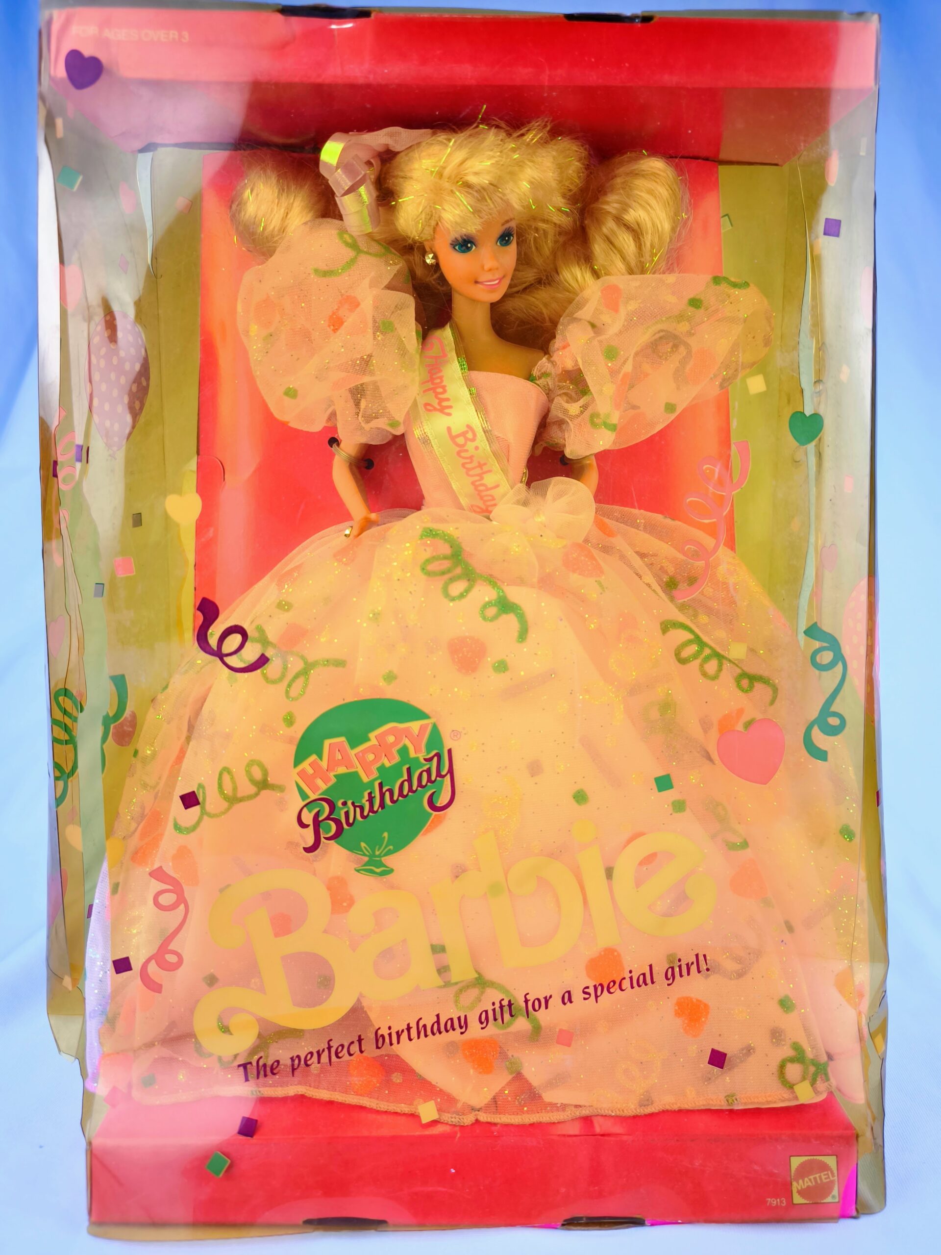 Muñeca de colección vintage Barbie Happy Birthday de 1990. Nueva, nunca sacada de la caja. Caja extremadamente dañada.