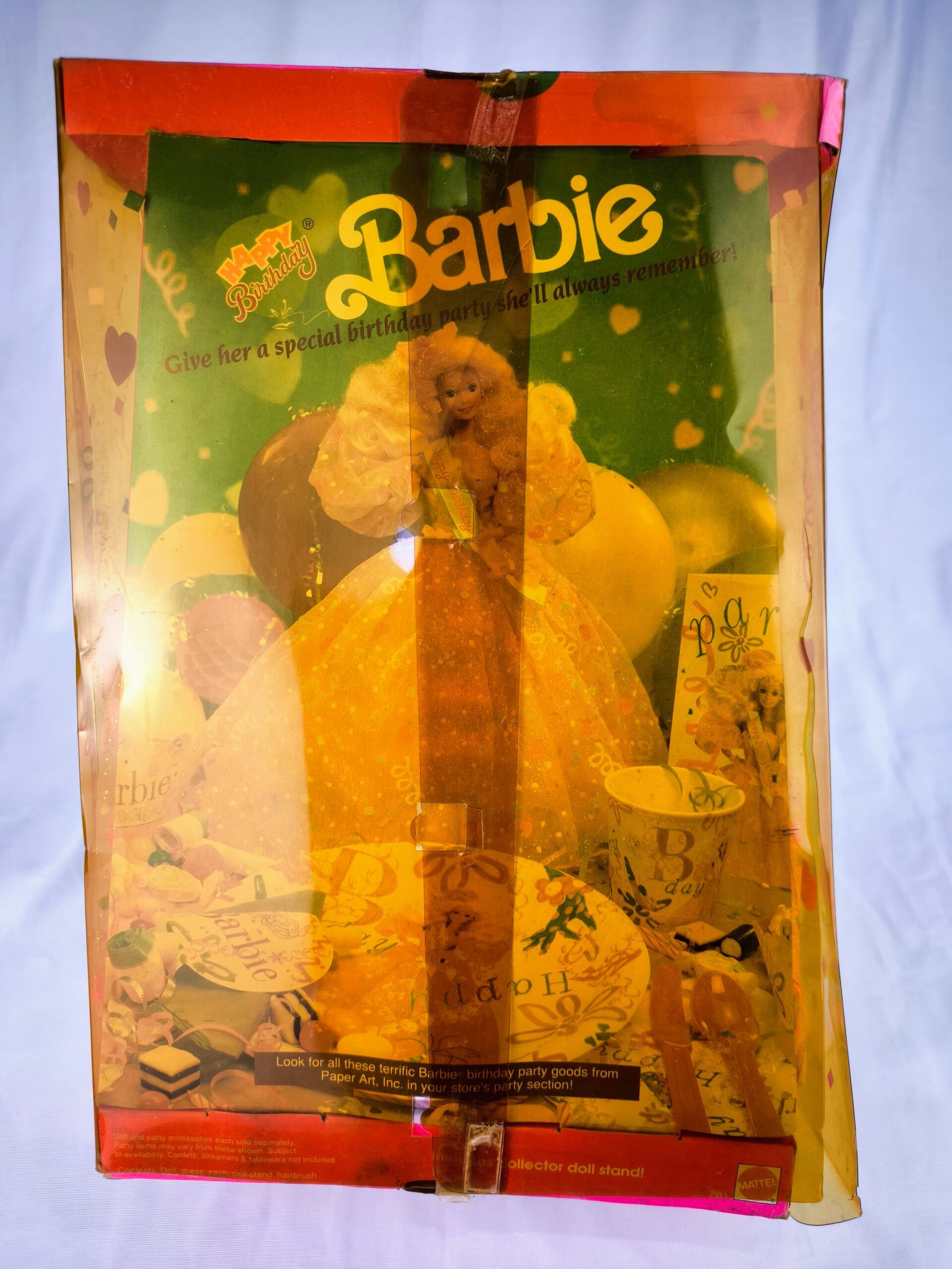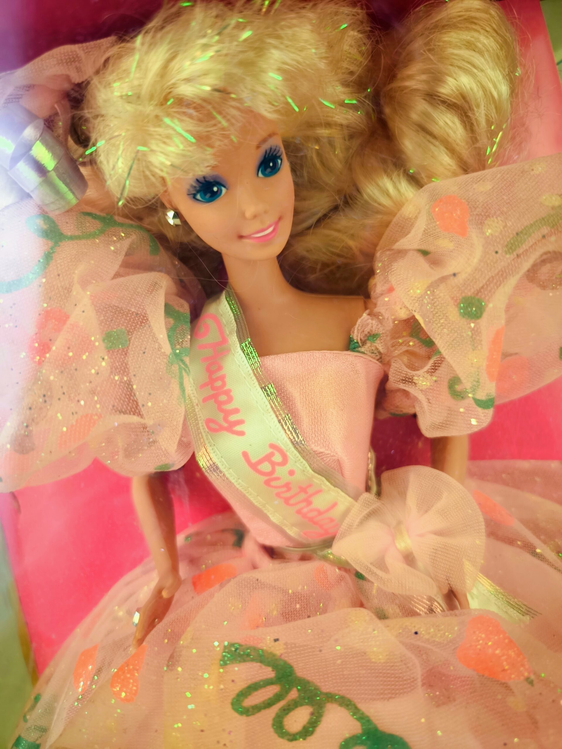 El Barbie Happy Birthday de 1990 es una edición especial de la icónica muñeca Barbie, diseñada para celebrar el cumpleaños de Barbie. Esta versión viene vestida con un hermoso vestido de fiesta rosado decorado con detalles en tul y lazo en la cintura. El vestido tiene un diseño festivo que captura la alegría y el espíritu de la ocasión.