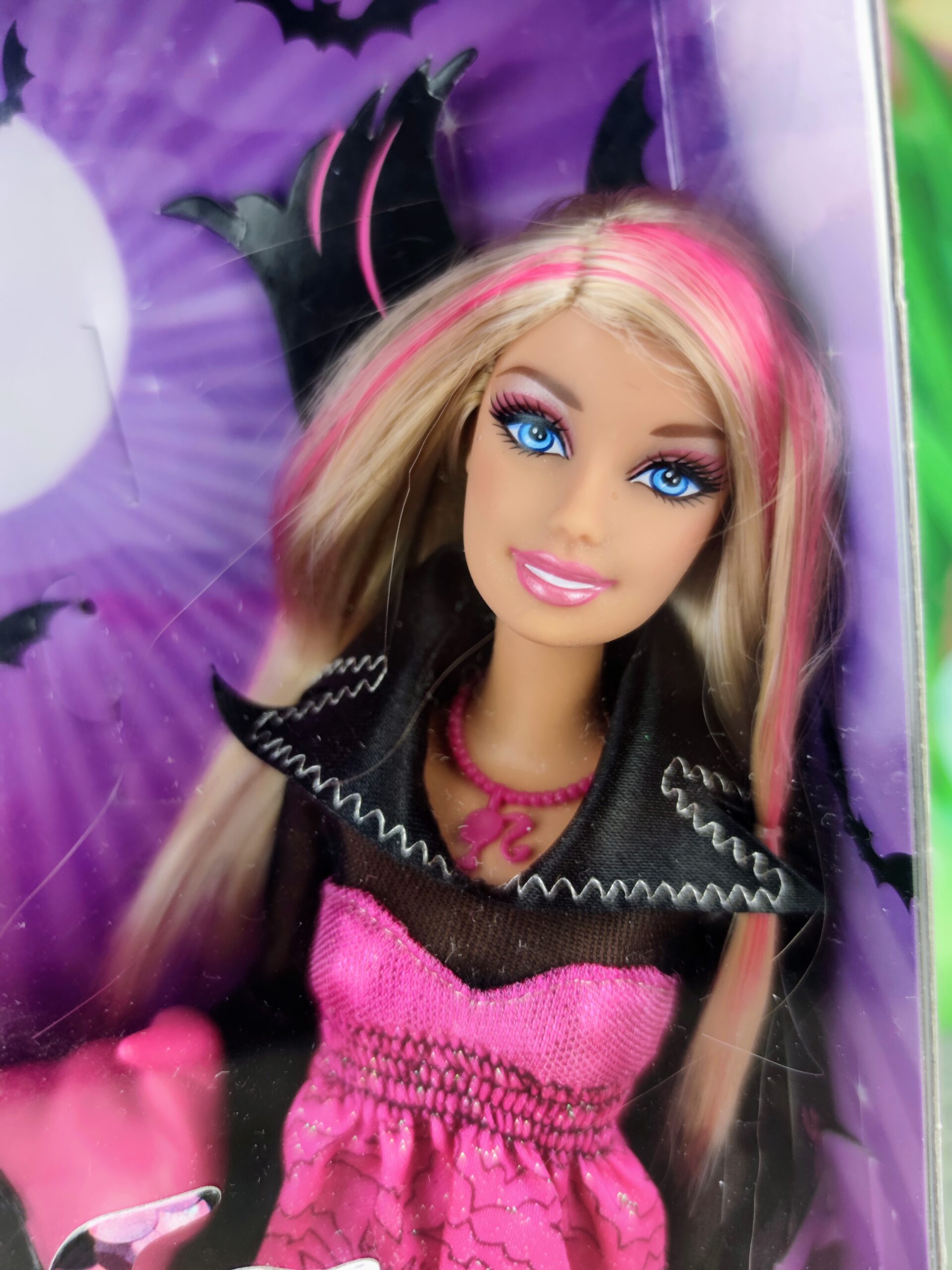 Vestida con un elegante vestido de gasa rosa adornado con murciélagos y detalles en negro, Barbie Happy Halloween tiene el cabello alisado con mechas rosas. Su maquillaje es un toque perfecto, con sombras oscuras y labios rosas que complementan su look de bruja moderna.