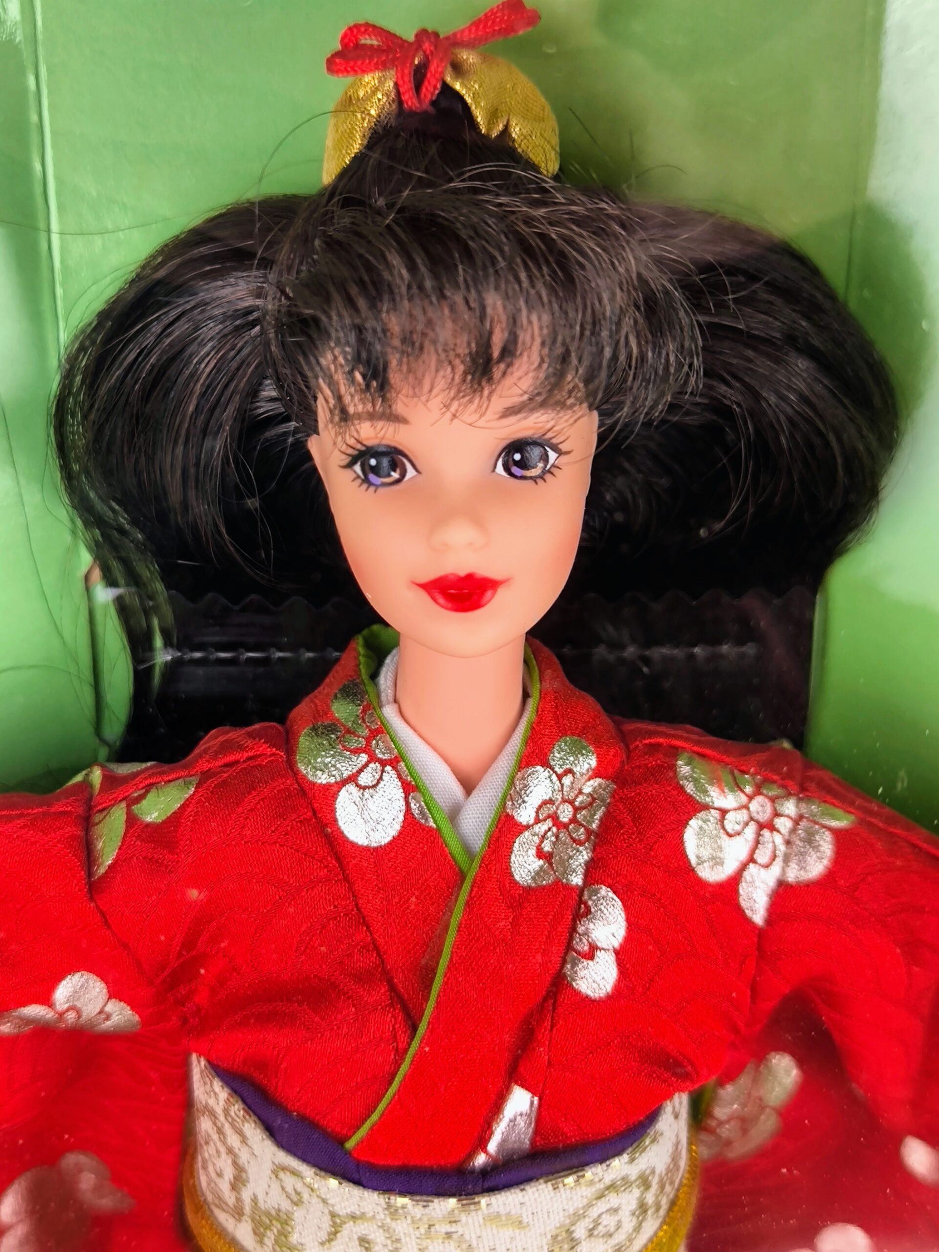Chino. Esta Barbie mide aproximadamente 30 centímetros y tiene el cabello negro recogido en un moño elegante con un lazo