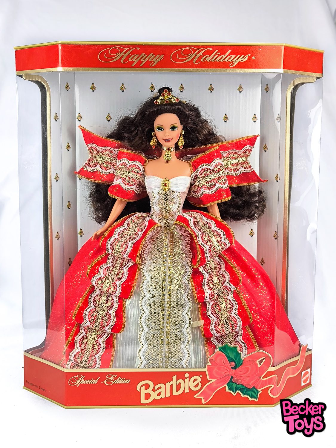 La Barbie Holiday de 1997 marcó el décimo aniversario de la serie Happy Holidays. Esta fue la única Barbie morena en la serie. La muñeca rubia estaba disponible como una edición muy limitada para los miembros del Barbie Collector Club y es mucho más rara y valiosa que la morena. Barbie lleva un vestido en tonos de rojo, blanco y dorado. Los acentos rojos en los hombros parecen alas de ángel. Además, lleva una tiara dorada con piedras rojas y un collar y aretes dorados también con piedras rojas. También existe una versión afroamericana de esta muñeca. ¡Una verdadera joya para celebrar la Navidad!