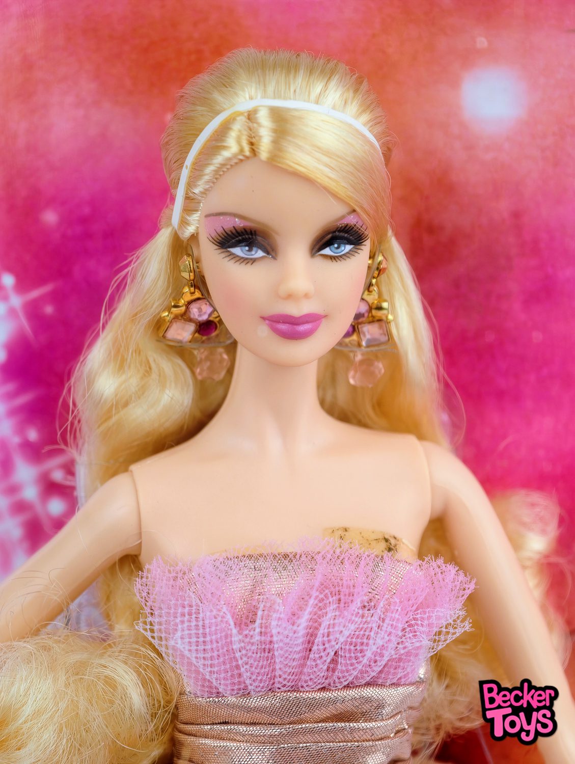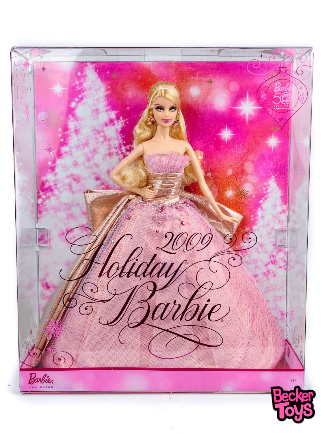 Barbie Holiday 2009 es una edición especial que celebra el 50 aniversario de Barbie. Esta muñeca está vestida con un impresionante vestido de gala en tonos rosa pálido y dorado, con un diseño envolvente en el corpiño y una falda de tul adornada con detalles brillantes. Los pendientes tipo candelabro añaden un toque de elegancia, y la muñeca incluye un adorno conmemorativo del 50 aniversario con una cinta dorada