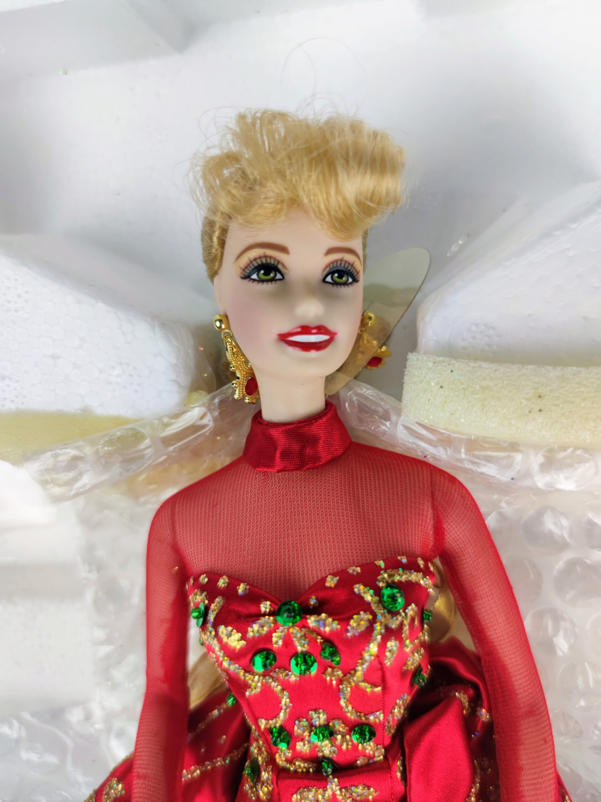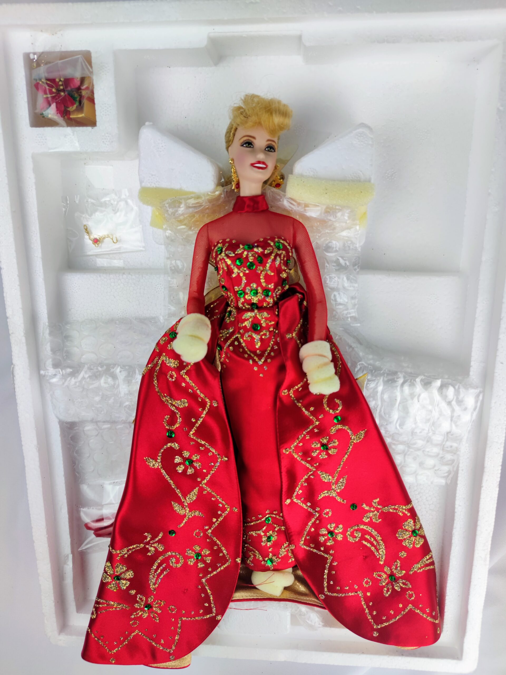 Barbie está vestida con un deslumbrante vestido de satén rojo con detalles de purpurina dorada y un lazo dorado en la cintura. El vestido tiene un corpiño con escote corazón y mangas de ilusión, y su falda larga con cola está adornada con cuentas de vidrio y lentejuelas doradas. Esta muñeca también incluye un certificado de autenticidad y es muy apreciada por los coleccionistas debido a su diseño y calidad.