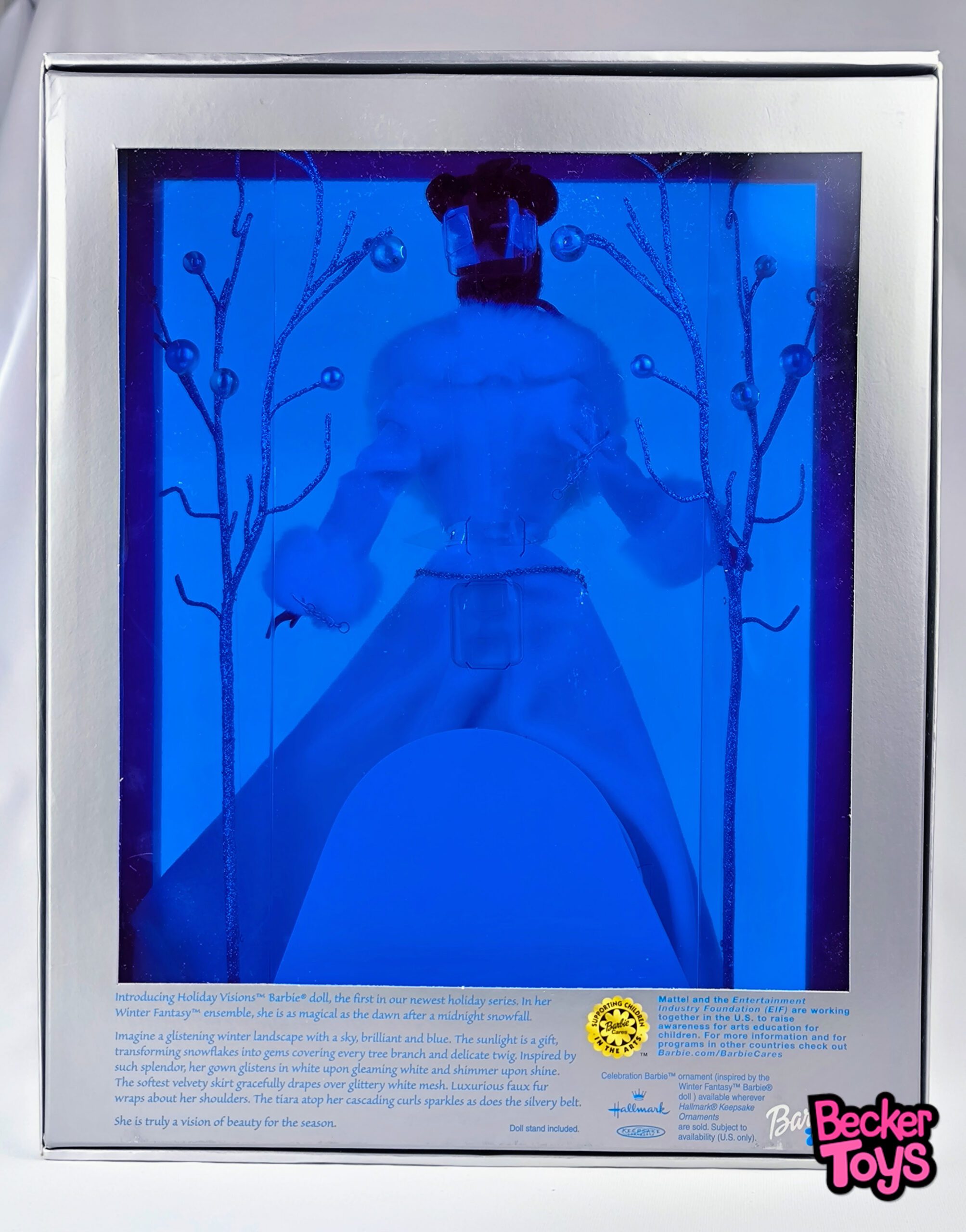 El empaque presenta un fondo invernal con tonos plateados y azules, evocando una noche nevada. Incluye el logo de Barbie Collector y el texto “Holiday Visions – Winter Fantasy Collection”. La caja está diseñada como vitrina, con ventana amplia y trasera con estética de lujo.