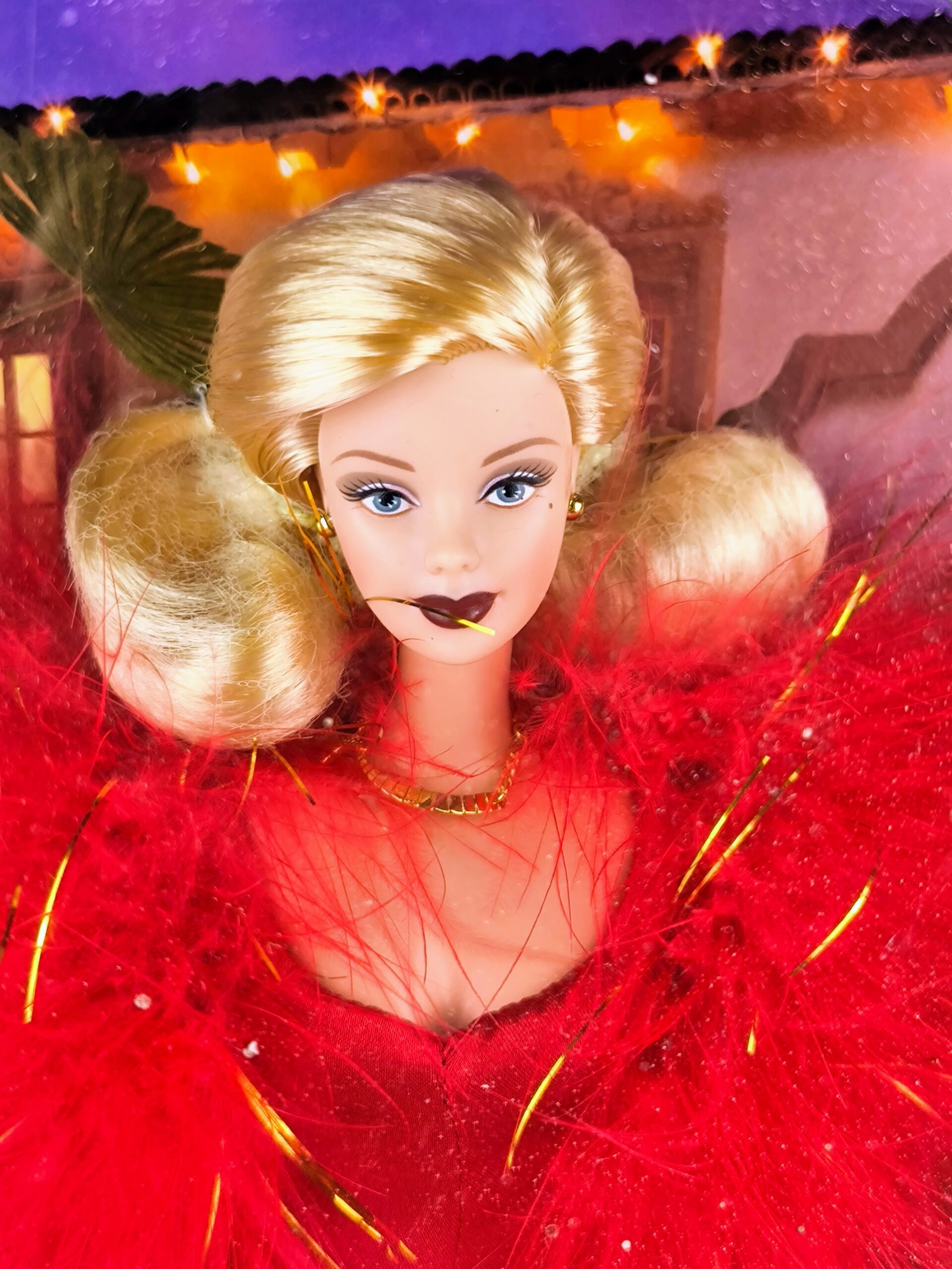 Luce un impresionante vestido rojo de charmeuse con un cinturón rojo adornado con una hebilla dorada. El conjunto se complementa con un elegante bolero de plumas rojas con hilos dorados, guantes largos rojos y joyas doradas, incluyendo un collar con un detalle de pedrería. Además, viene con una base para exhibirla y un certificado de autenticidad, lo que la convierte en una pieza ideal para coleccionistas.