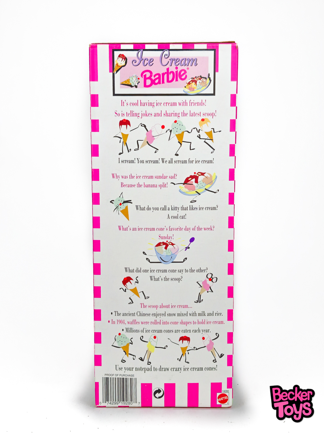 La muñeca mide aproximadamente 29cm y viene en su empaque original sin abrir, lo que preserva su valor como coleccionable. La Barbie Ice Cream es una reproducción original con licencia de Mattel y forma parte de la línea de productos Ice Cream Barbie. Su tez es de tono medio y es una muñeca femenina de etnia caucásica.