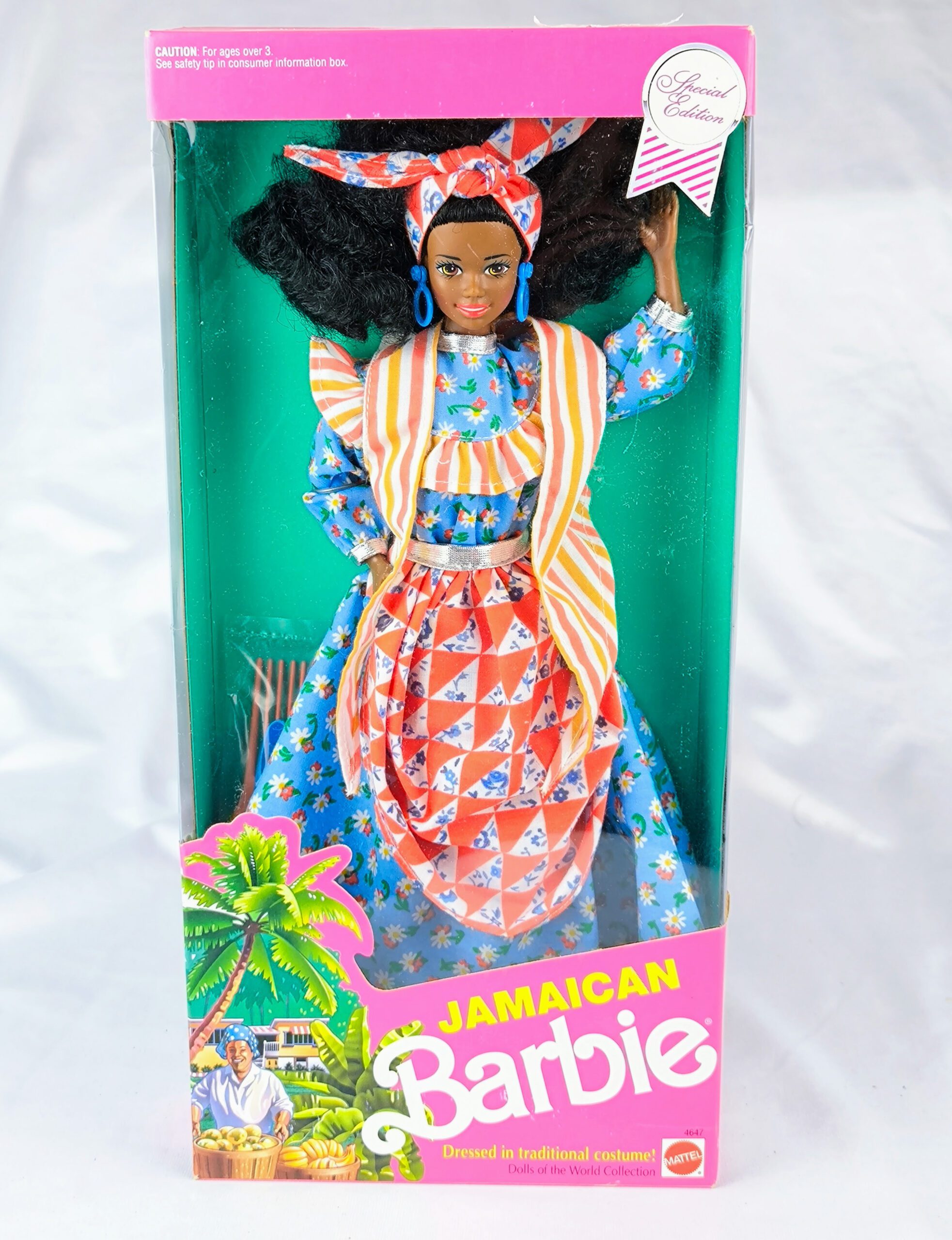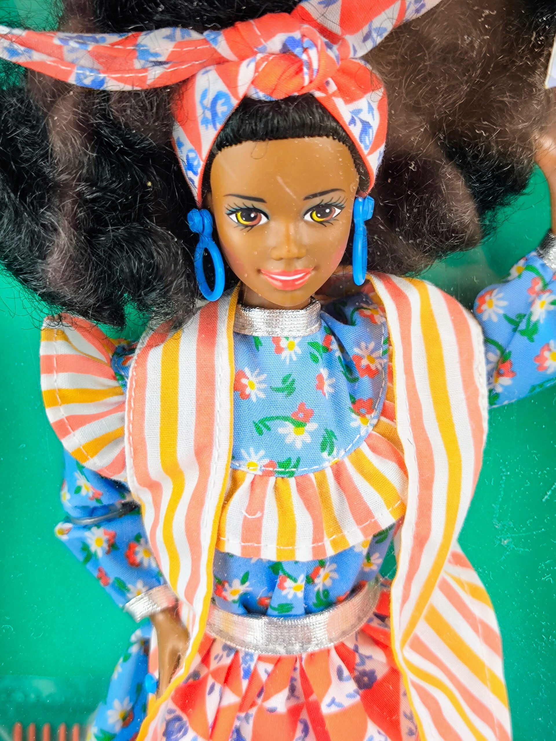 - Descripción: La muñeca Barbie lleva un traje típico de su tierra natal, la isla tropical de Jamaica. Su fresco vestido de algodón azul está adornado con un delantal rojo y blanco en la cintura, y un pañuelo colorido drapeado sobre sus hombros.