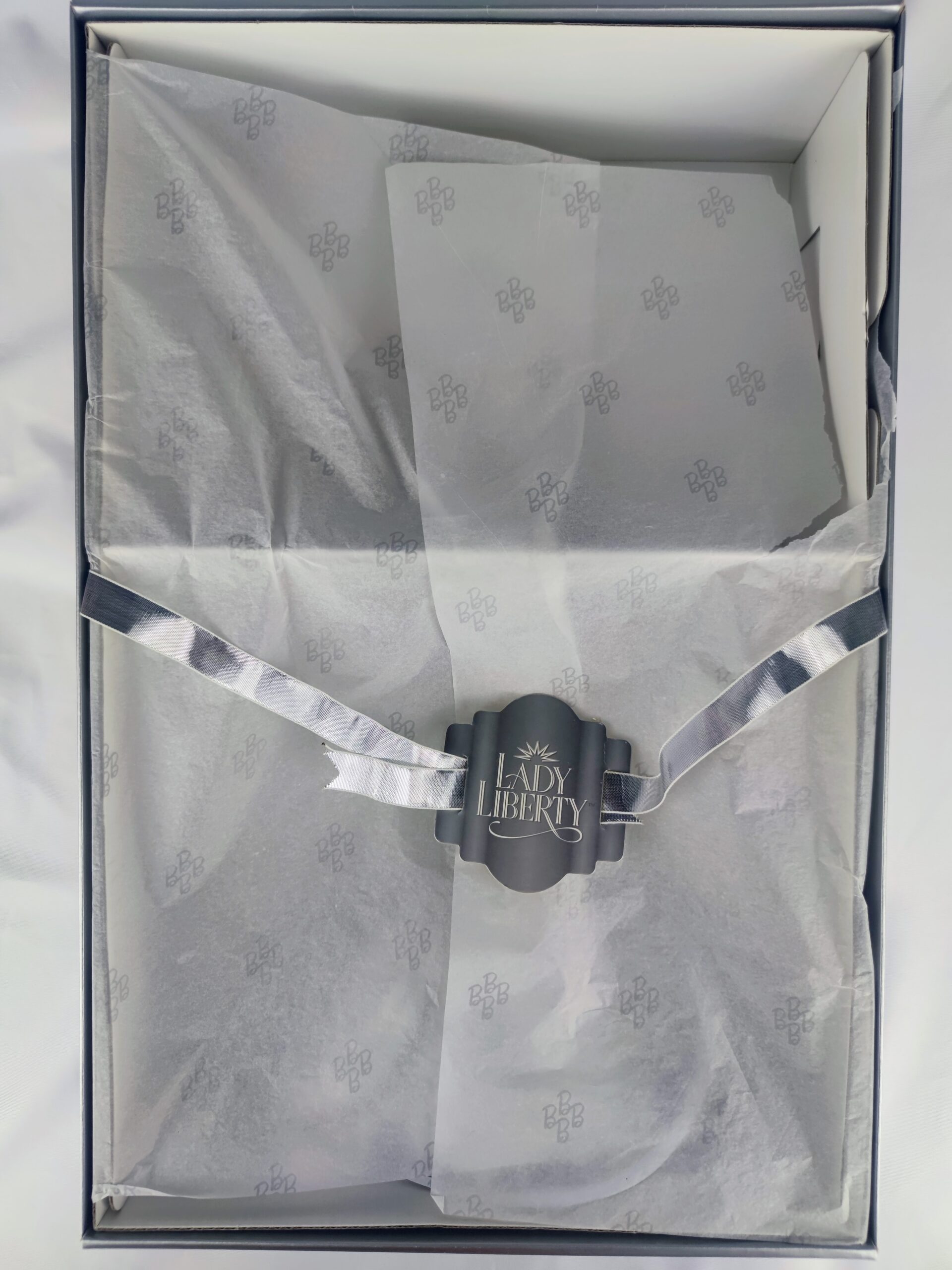 Luce un elaborado tocado que inicia una cascada de brillantes rhinestones y estrellas que rodean su longitud. En su mano derecha, sostiene una antorcha plateada, evocando la Estatua de la Libertad. Sus pies están calzados con zapatos plateados, completando su apariencia deslumbrante de pies a cabeza.