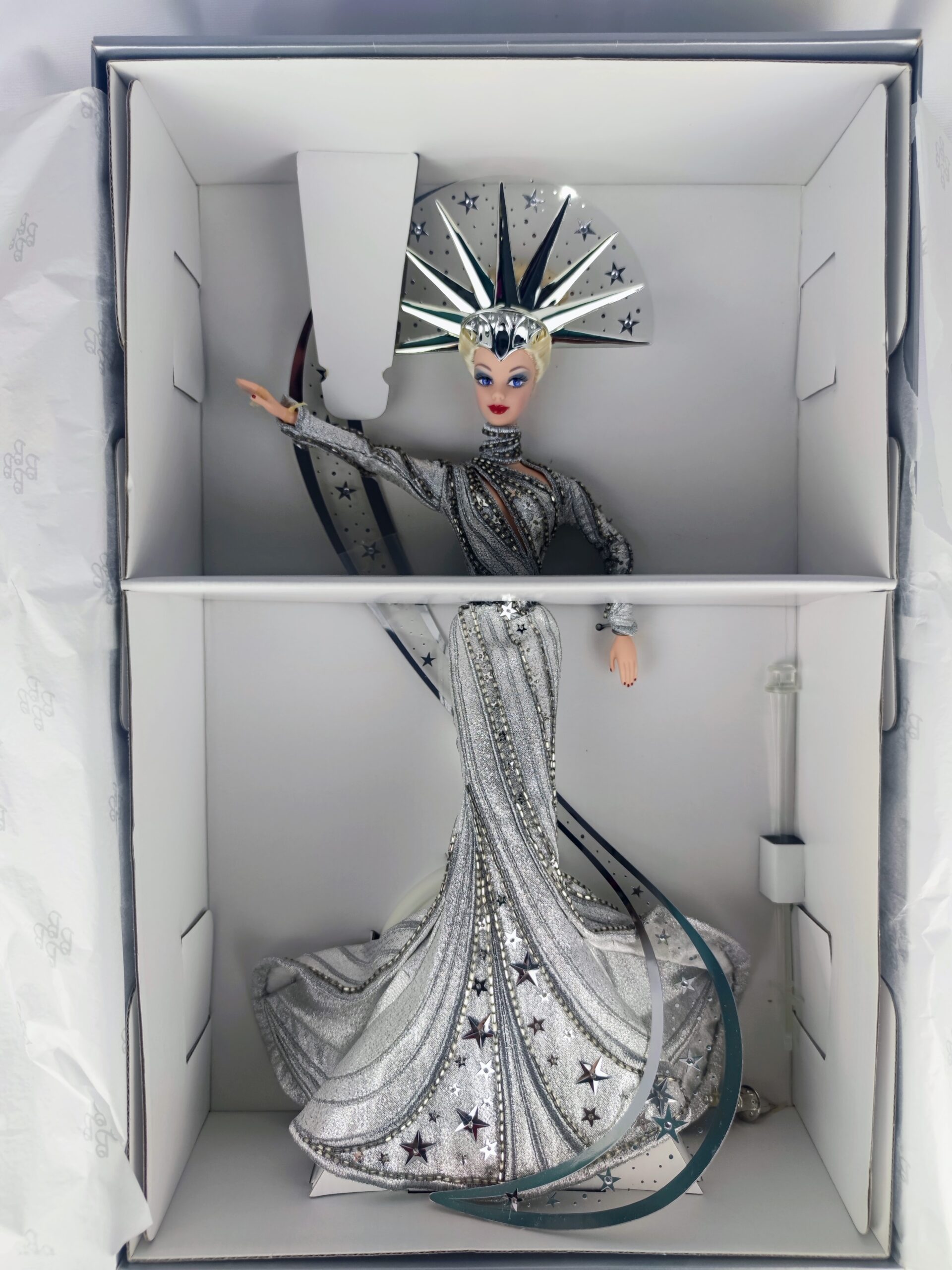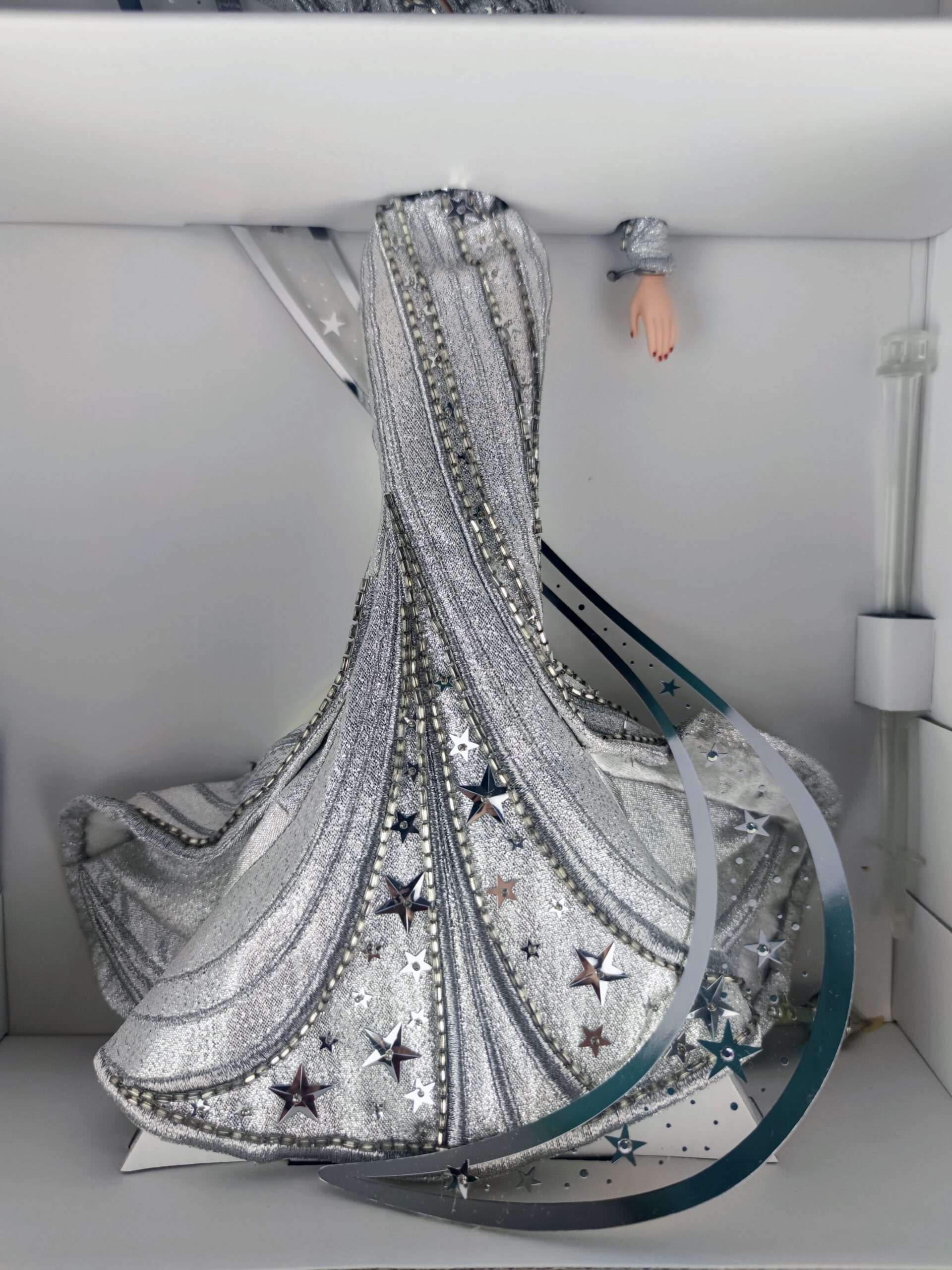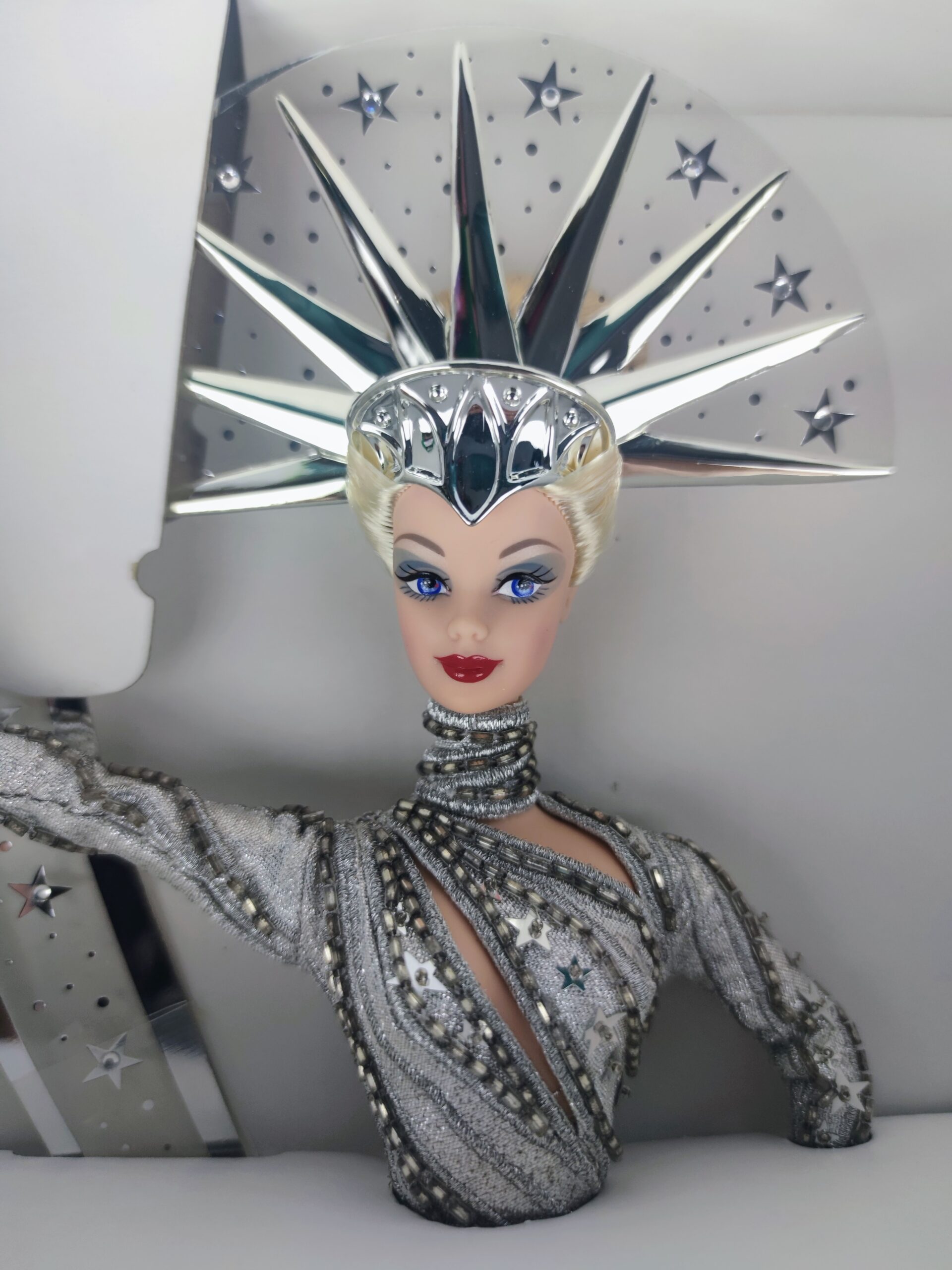La Barbie Lady Liberty de 2000, diseñada por Bob Mackie, es una obra maestra que conmemora un hito clásico estadounidense. Esta muñeca está vestida con un elegante vestido metálico plateado, ajustado y de manga larga, que se extiende en una cola barrida a sus pies. El vestido está adornado con bordados plateados, cuentas de bugle y lentejuelas en forma de estrella.