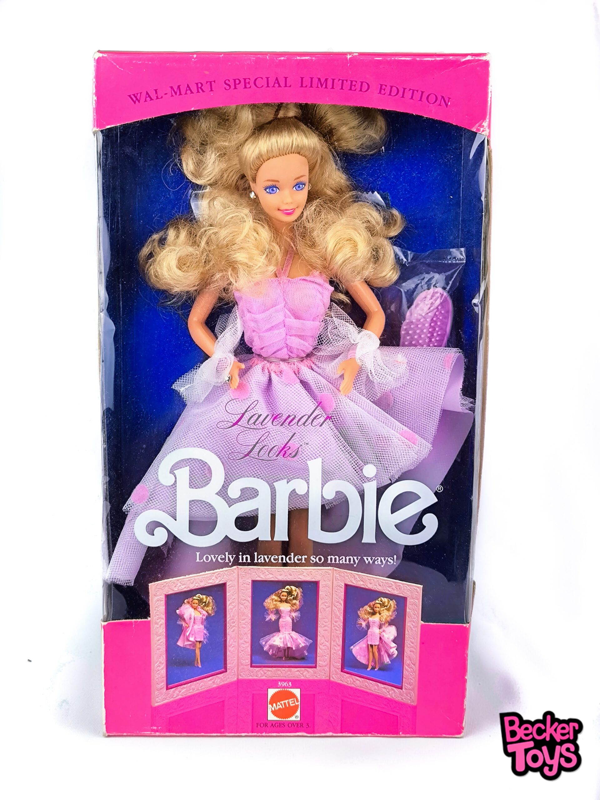 Barbie Lavender Looks (1989) es una muñeca de moda de 30 cm fabricada por Mattel como parte de una colección exclusiva de Walmart. Esta Barbie tiene el cabello rubio rizado y lleva un elegante vestido de color lavanda, diseñado con un estilo romántico y sofisticado. El vestido, que es la pieza central de su atuendo, está adornado con detalles de encaje y un elegante lazo en la cintura, ofreciendo la posibilidad de transformarse en varios estilos únicos, adaptándose a diferentes ocasiones.