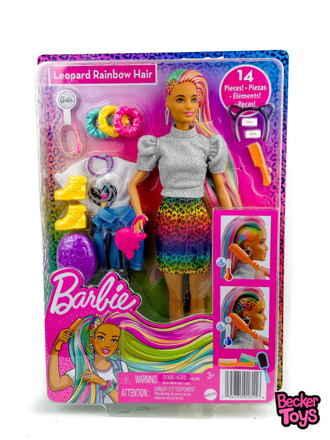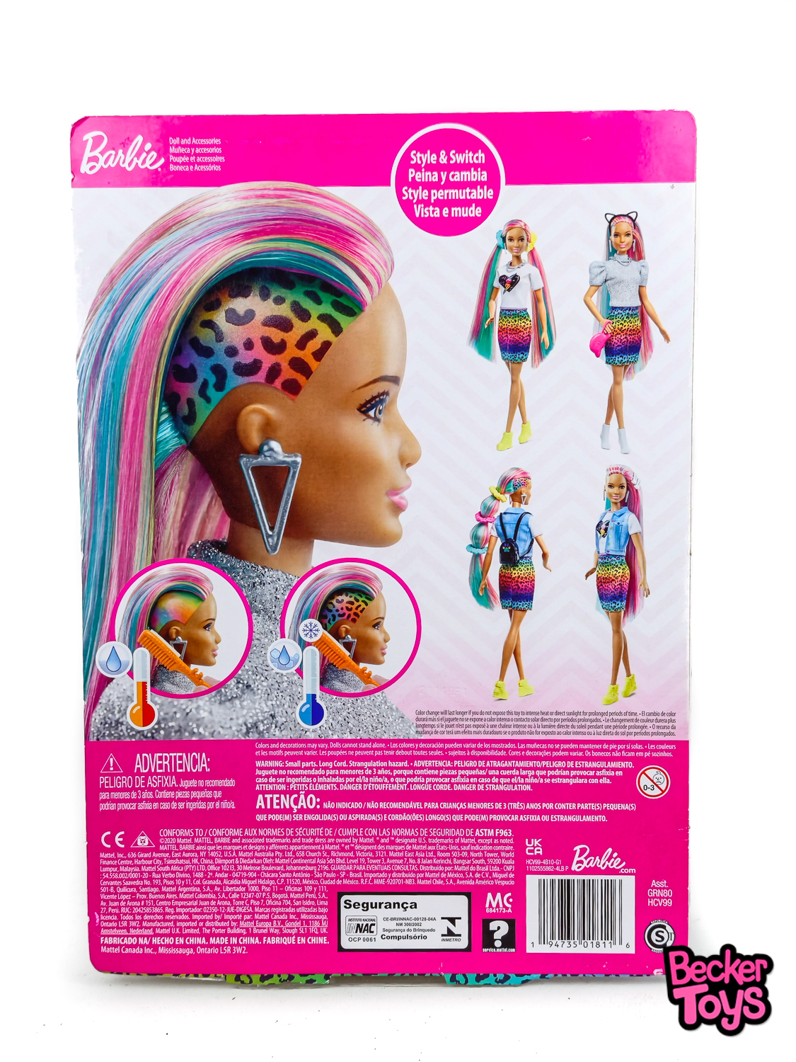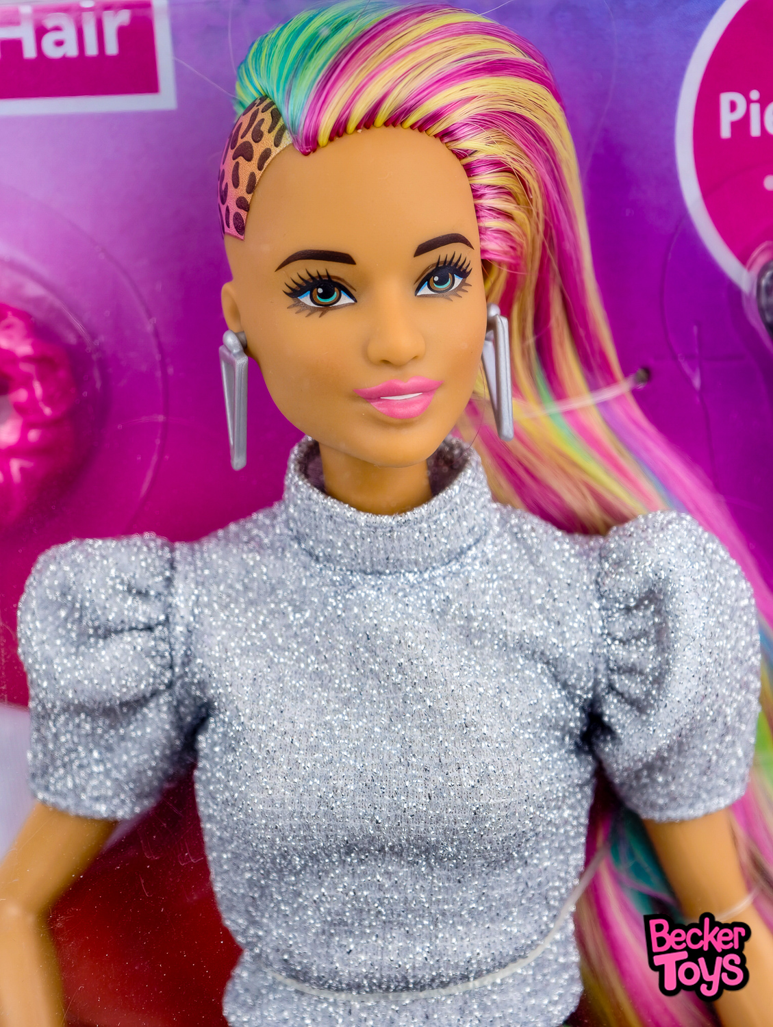 Barbie Leopard Rainbow Hair de 2020 en su blíster original. Muñeca Barbie con cabello largo multicolor en tonos rosa, amarillo, verde y azul, con lateral rapado decorado con estampado de leopardo multicolor. Lleva top plateado de manga corta abullonada y falda ajustada con estampado arcoíris animal print.