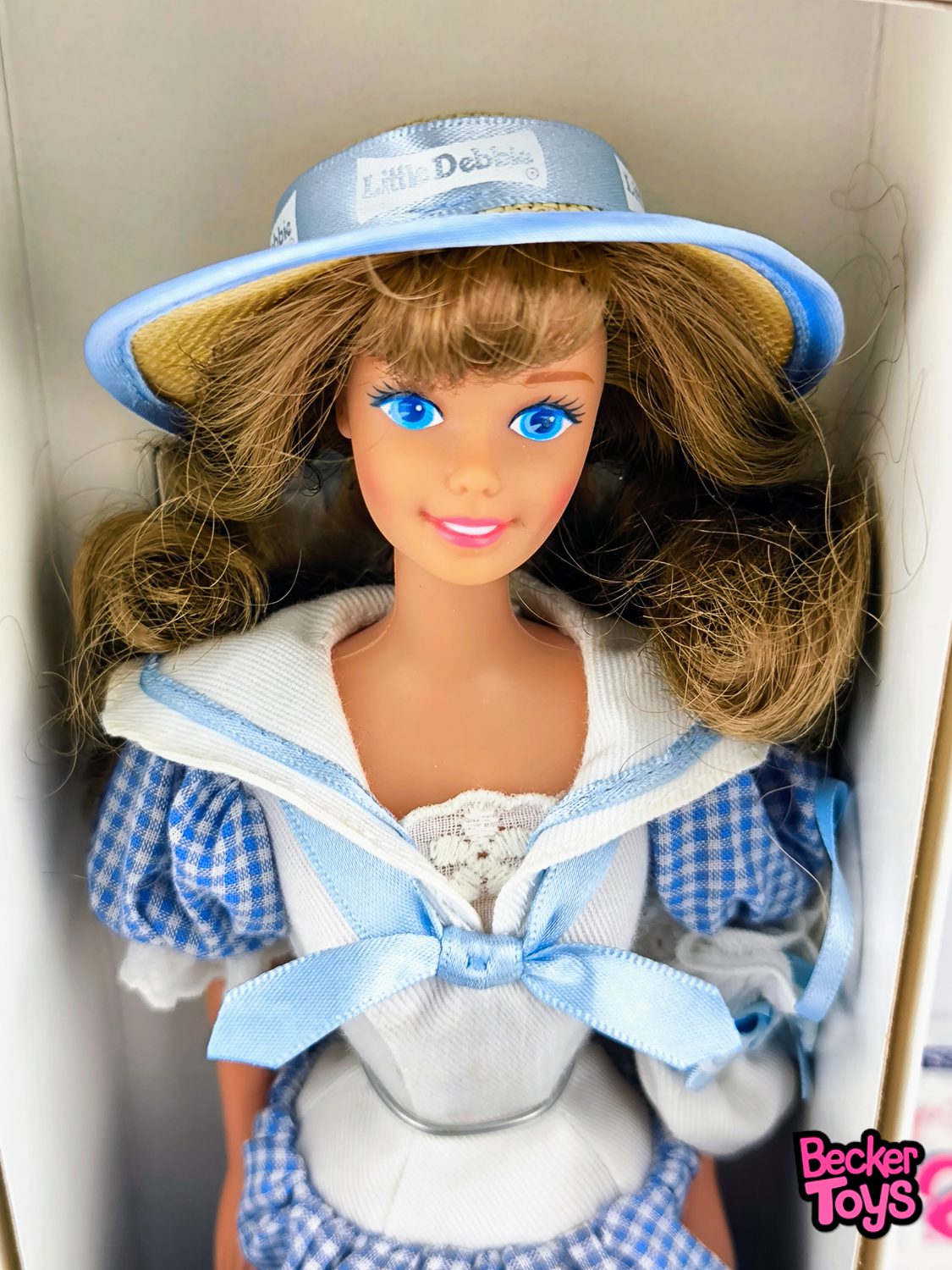 Barbie Little Debbie Series III (1997) es una encantadora edición de coleccionista lanzada por Mattel como parte de la colaboración con la marca de snacks Little Debbie. Esta muñeca de 12 pulgadas destaca por su dulce estética inspirada en la imagen clásica de la “chica Little Debbie”, con un vestido azul de cuadros gingham adornado con volantes, mangas abullonadas, cuello marinero y una enagua integrada. Complementa su look con zapatos azules, un sombrero de paja crujiente, bolso a juego y cintas azules decorativas. Su largo cabello castaño y ojos azules le dan un aire inocente y nostálgico, evocando la estética americana de mediados del siglo XX. Presentada en su caja original, esta Barbie es una pieza muy valorada por coleccionistas por su diseño vintage, su edición limitada y su vínculo con una marca icónica de la cultura popular estadounidense