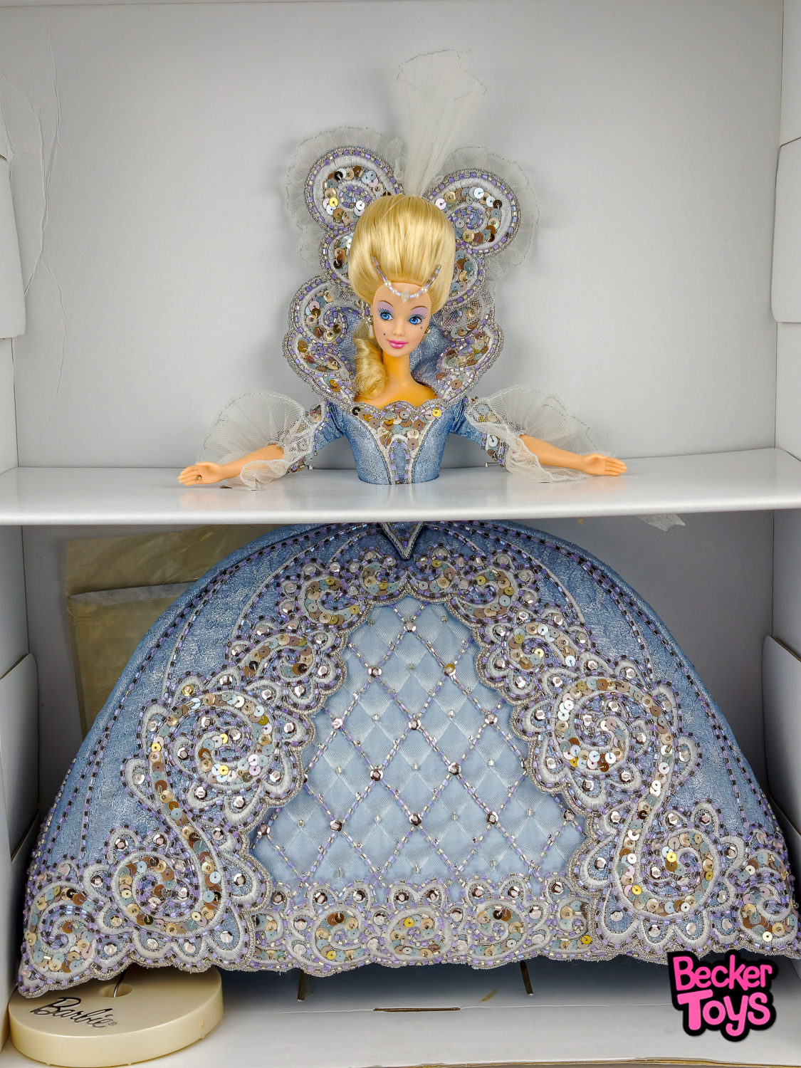 - Accesorios: Lleva una tiara en la cabeza, lo que le da un aspecto de princesa de la corte. Además, incluye un soporte para la muñeca, un certificado de autenticidad y una ilustración de moda firmada por Bob Mackie.