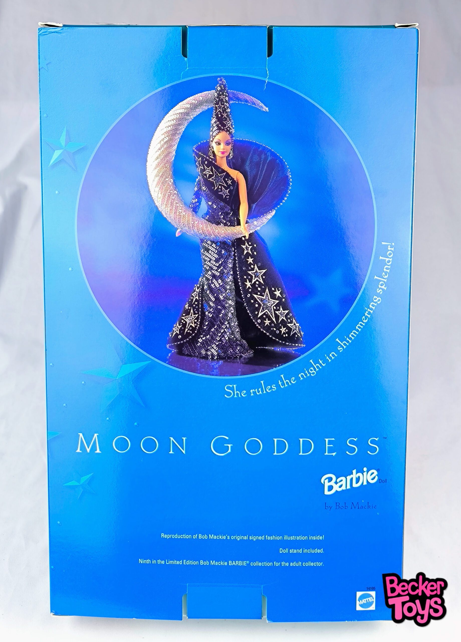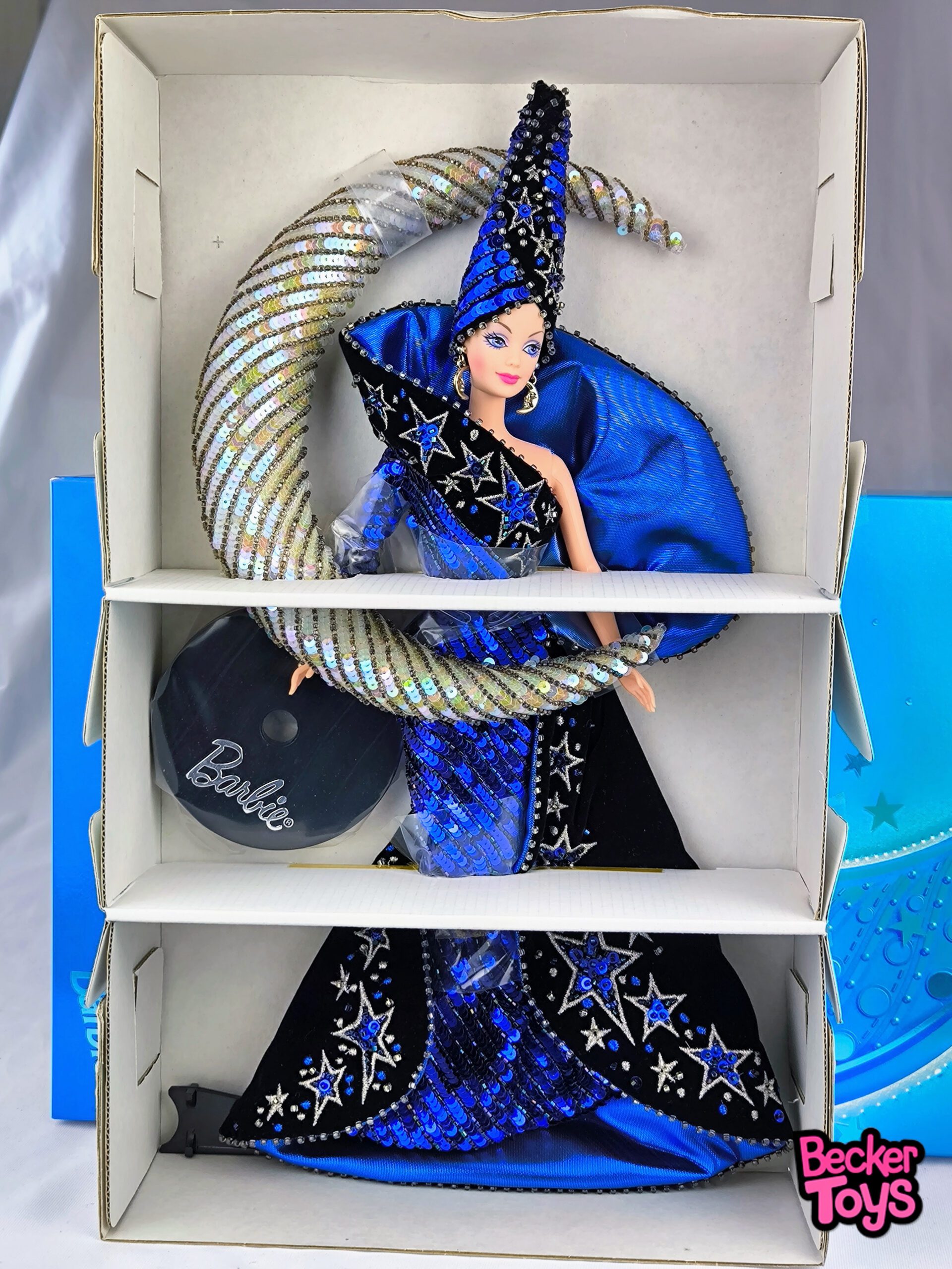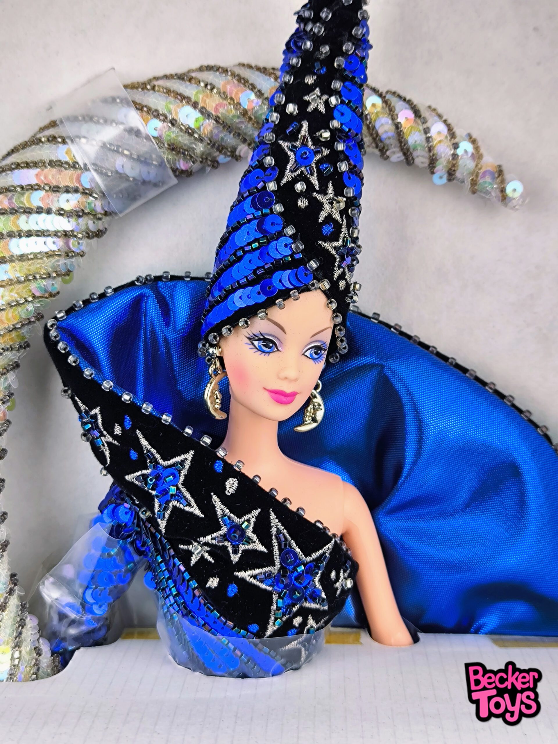 Barbie «Moon Goddess» de 1996, diseñada por el legendario Bob Mackie, es una pieza de colección deslumbrante. Esta muñeca lleva un vestido negro y azul decorado con estrellas y lentejuelas, evocando la magia y el misterio de la luna. Su diseño incluye un impresionante escote, un sombrero puntiagudo y una capa plateada que fluye elegantemente, complementada por pendientes en forma de luna creciente.