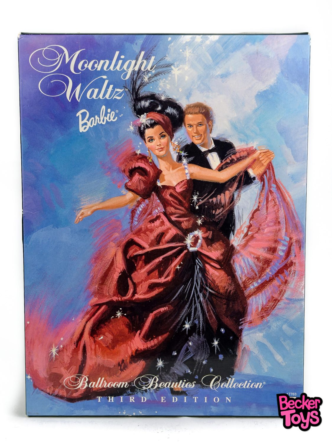 La Barbie Moonlight Waltz de 1997 es una muñeca de colección que destaca por su elegancia y sofisticación. Esta Barbie está vestida para una noche de baile bajo la luz de la luna, con un impresionante vestido de tafetán rojo ladrillo adornado con tul negro y lentejuelas.