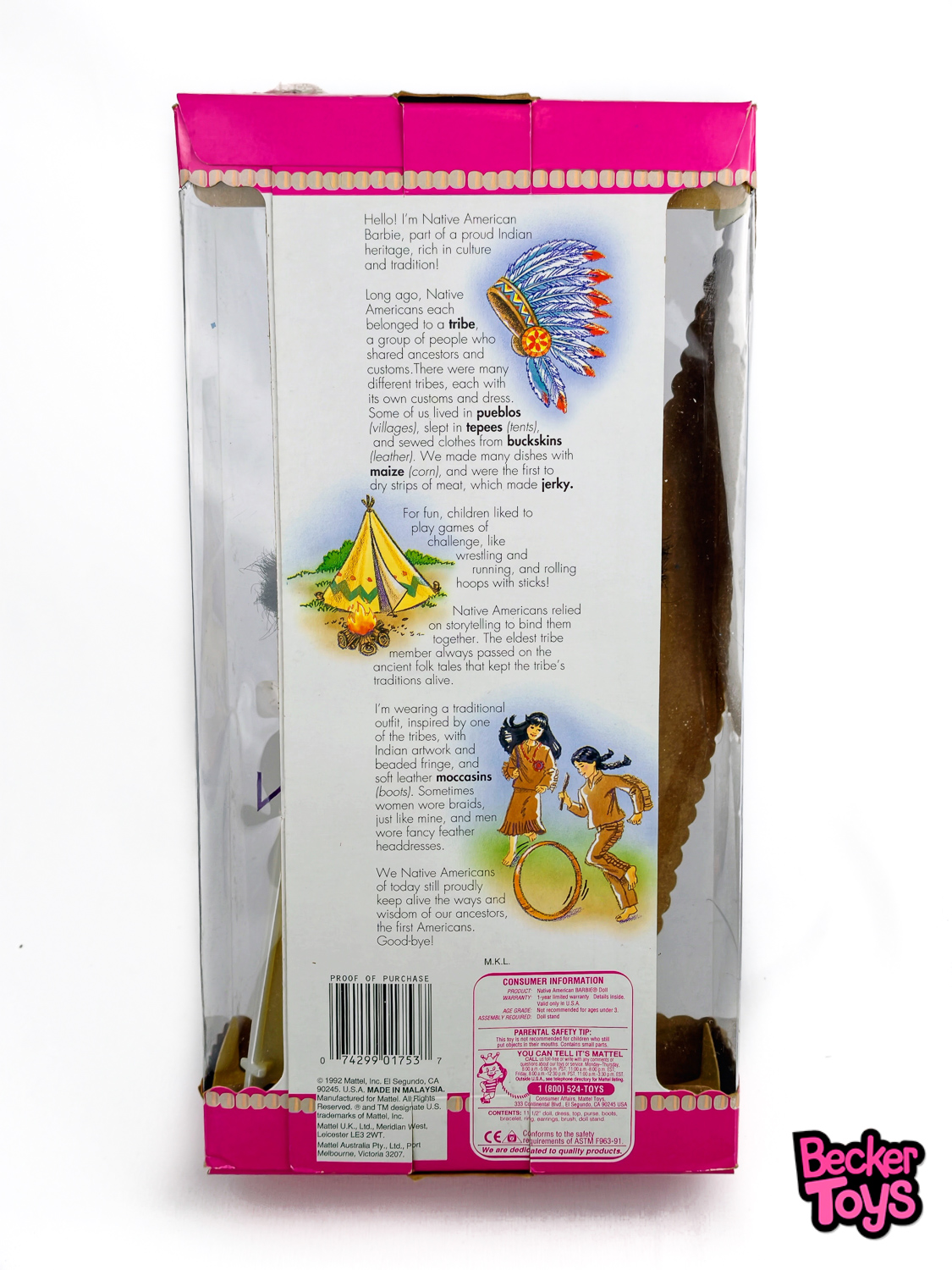 El empaque original de esta muñeca proporciona información educativa sobre la historia y las costumbres de las tribus nativas americanas, añadiendo un valor cultural y educativo a esta pieza de colección.