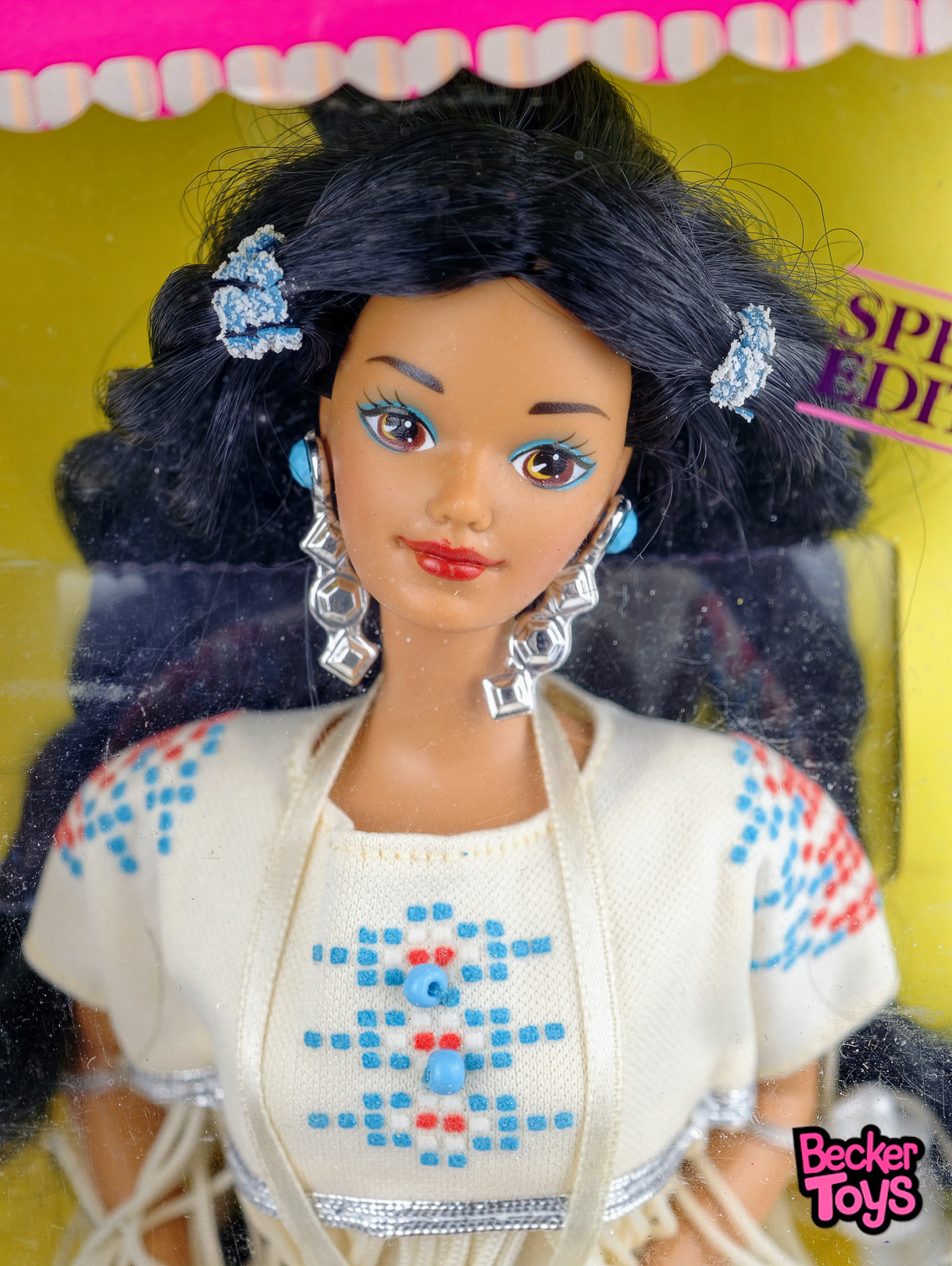 Barbie Native American de 1992 es otra joya dentro de la serie Dolls of the World de Mattel. Esta muñeca está diseñada para rendir homenaje a las ricas culturas y tradiciones de las comunidades nativas americanas. La Barbie lleva un vestido largo y elegante de tonos marrones y beige, decorado con detalles en franjas y cuentas, evocando la vestimenta tradicional. Unas plumas adornan su cabello oscuro, que está peinado en trenzas, y lleva accesorios que complementan su atuendo, como un collar y pendientes de inspiración indígena.
