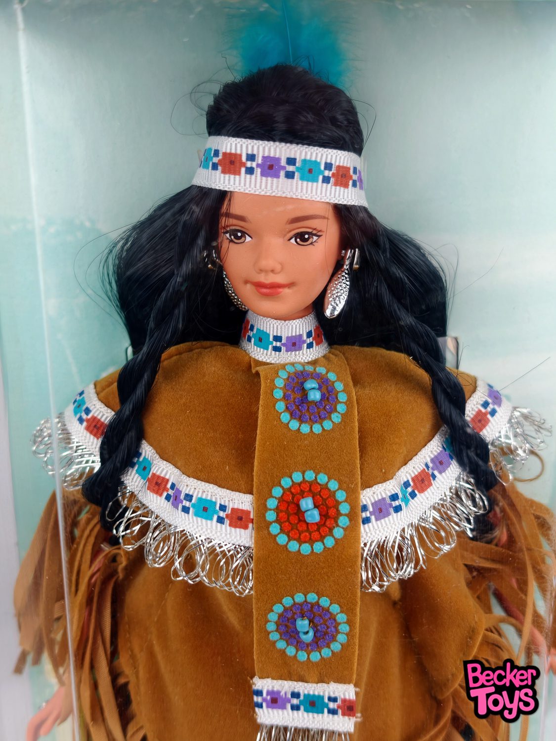 Lleva un poncho marrón, una falda decorativa, un felpa en la cabeza, mocasines y joyería que reflejan la rica cultura y tradición de los nativos americanos. La muñeca también viene con un peine y una base de exhibición para coleccionistas.