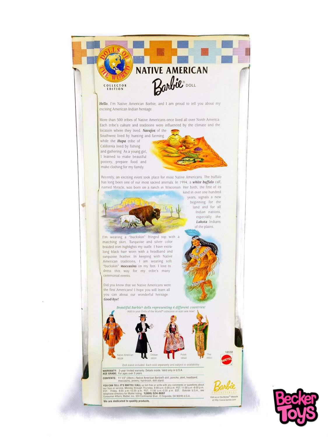 El empaque es vibrante y colorido, con imágenes que destacan la belleza y el patrimonio cultural de las tribus nativas americanas. Esta Barbie es una pieza ideal para coleccionistas y aquellos que aprecian la diversidad cultural y la representación histórica en las muñecas.