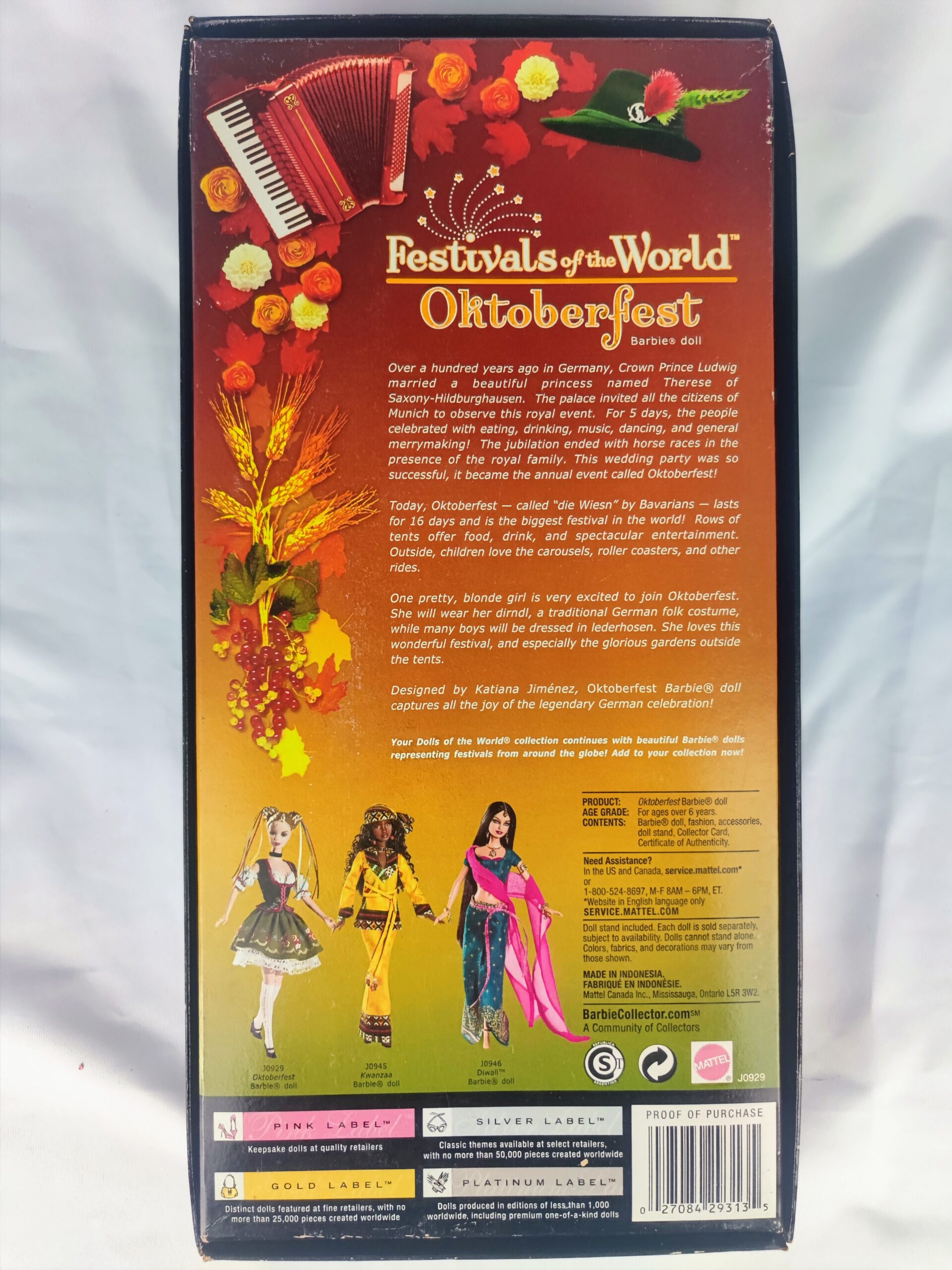 Barbie Oktoberfest Festivals of the World de 2006 es una muñeca de edición especial que celebra el famoso festival alemán. Esta Barbie viene vestida con un tradicional dirndl bávaro, que incluye una blusa blanca, un corsé verde con detalles dorados y una falda roja con un delantal blanco.