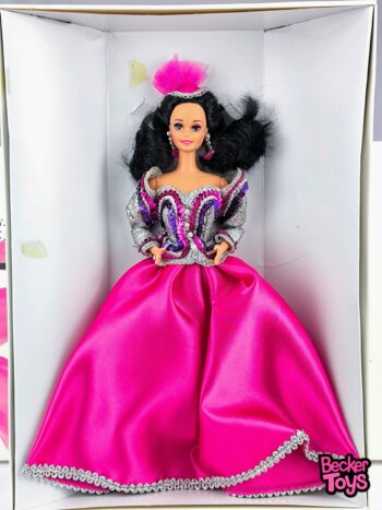Barbie Opening Night Classique de 1993 es una edición de colección que destaca por su elegancia y sofisticación. Forma parte de la línea Classique de Mattel, conocida por sus diseños exclusivos y detallados. Esta muñeca luce un vestido de gala en tonos fucsia con detalles brillantes, acompañado de accesorios plateados que realzan su estilo refinado. Su cabello oscuro y sus pestañas largas le dan un aire glamuroso, ideal para una noche especial.