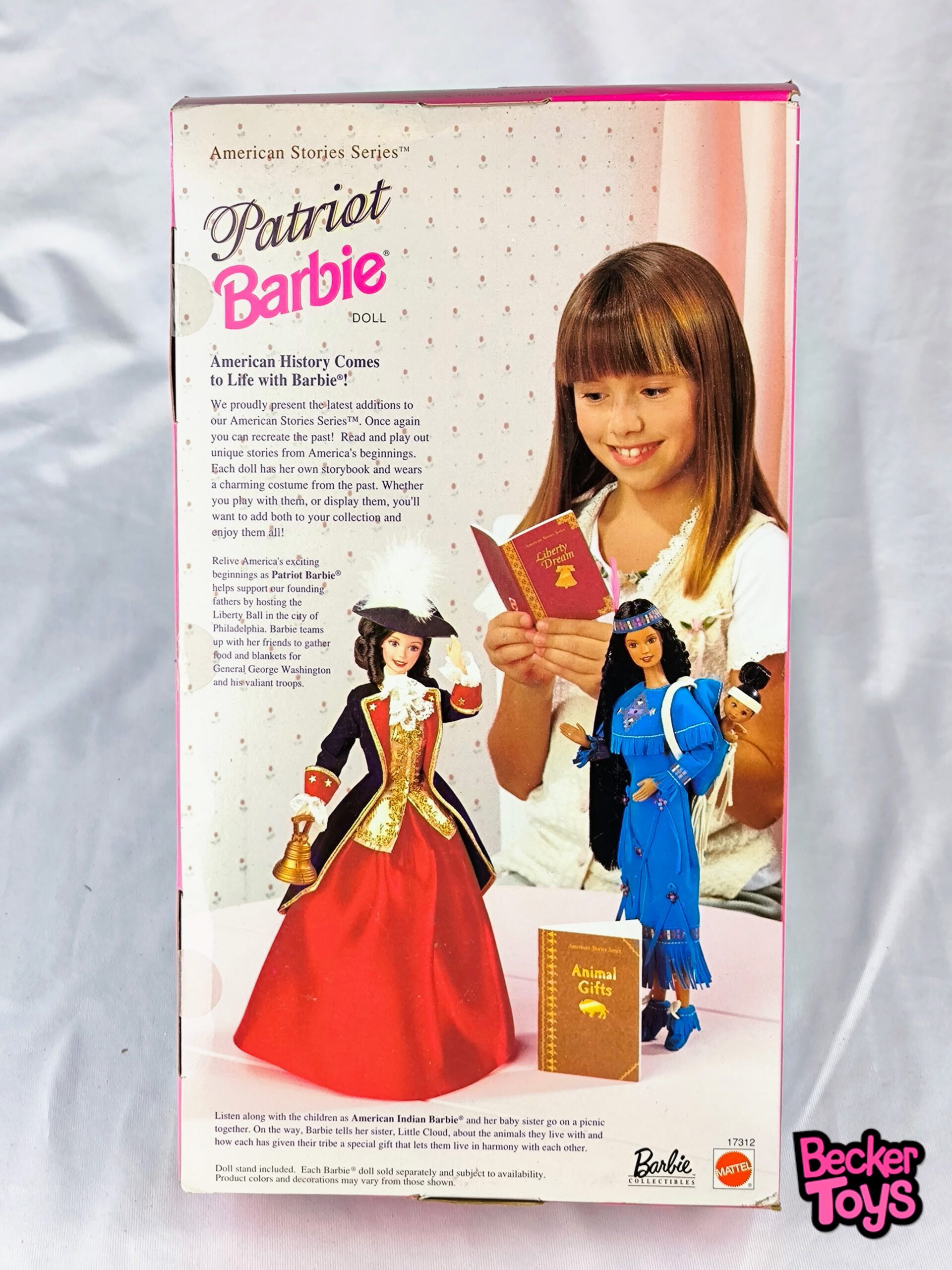 La Barbie Patriot de la colección American Stories de 1996 es una muñeca que celebra la historia americana, reviviendo los emocionantes comienzos de Estados Unidos. Esta edición de coleccionista presenta a Barbie como una patriota que apoya a los padres fundadores al organizar el Liberty Ball en la ciudad de Filadelfia.